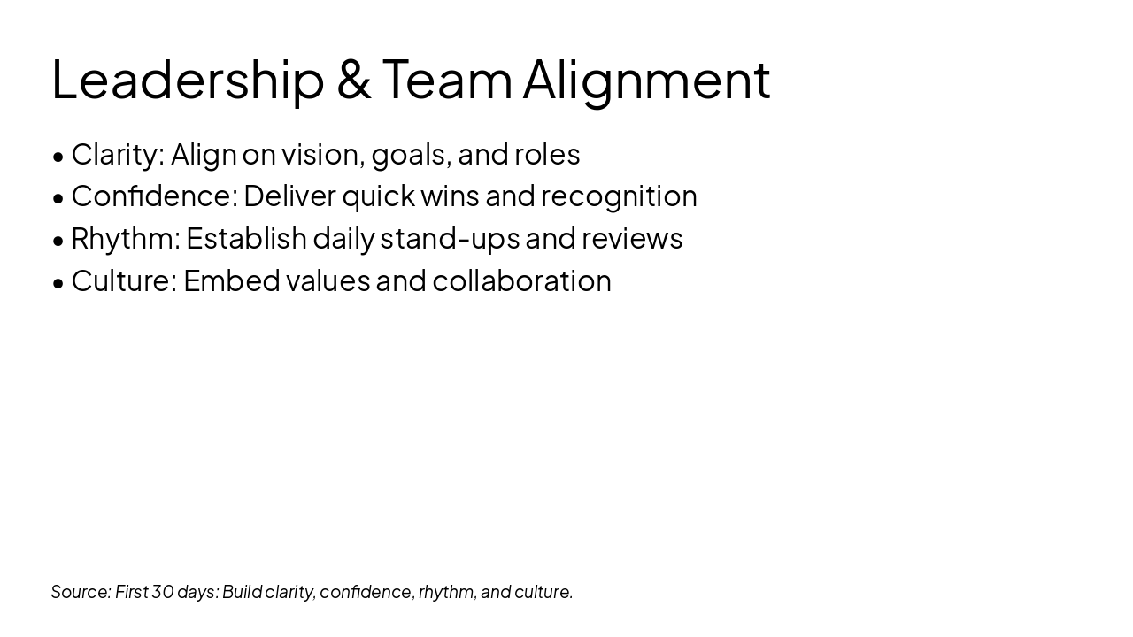 Top priorities, key milestones, early KPIs for rapid scaling.