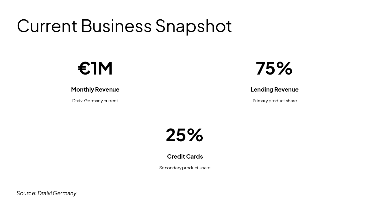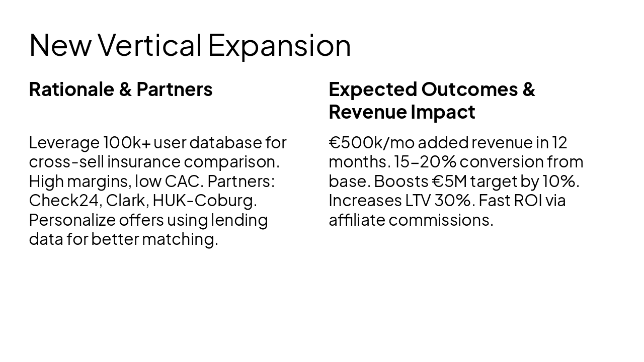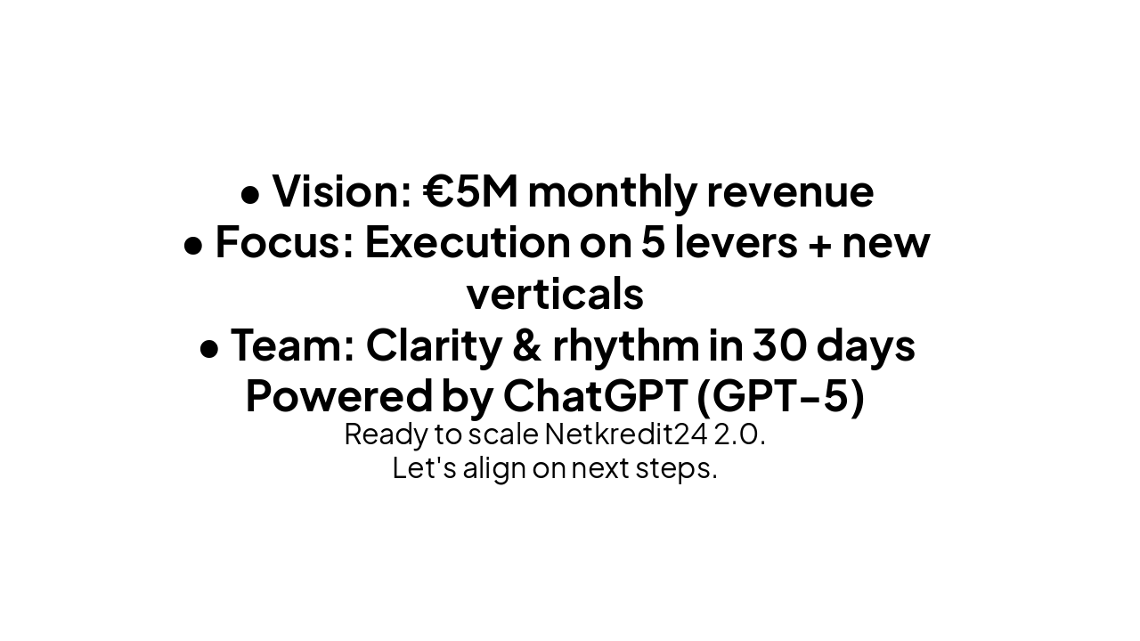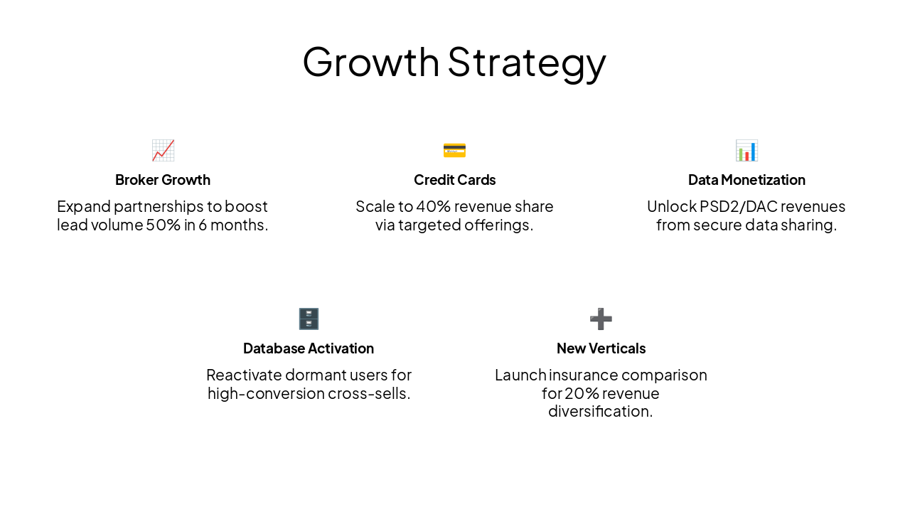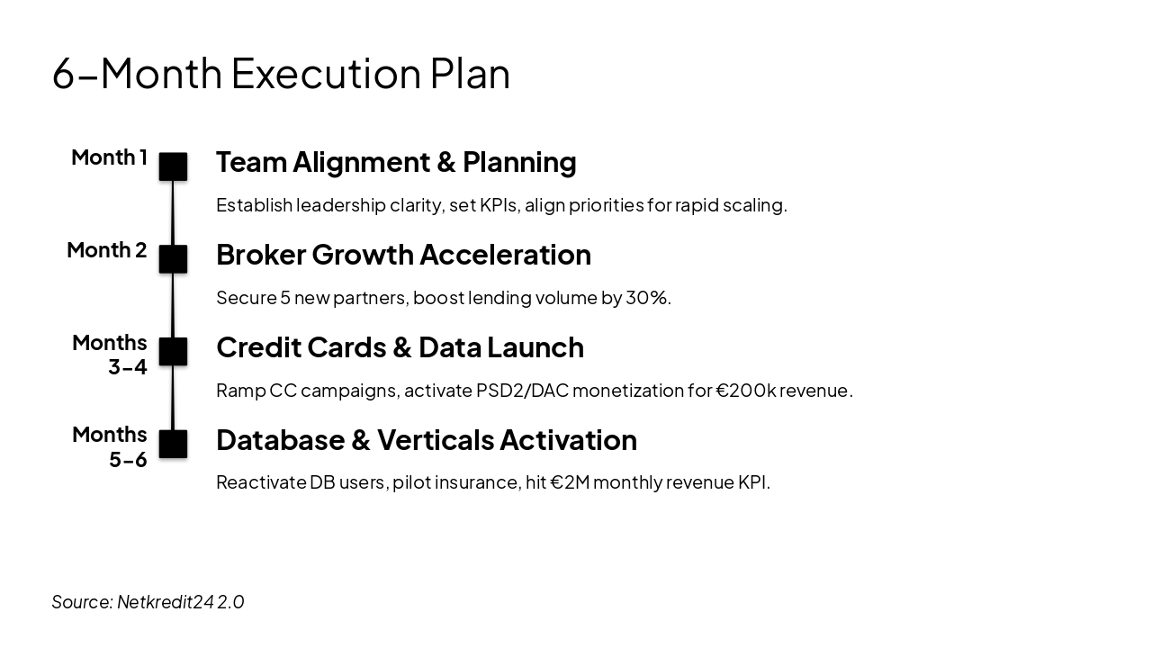 Month 1: Team Alignment & Planning Establish leadership clarity, set KPIs, align priorities for rapid scaling. Month 2: Broker Growth Acceleration Secure 5 new partners, boost lending volume by 30%. Months 3-4: Credit Cards & Data Launch Ramp CC campaigns, activate PSD2/DAC monetization for €200k revenue. Months 5-6: Database & Verticals Activation Reactivate DB users, pilot insurance, hit €2M monthly revenue KPI.