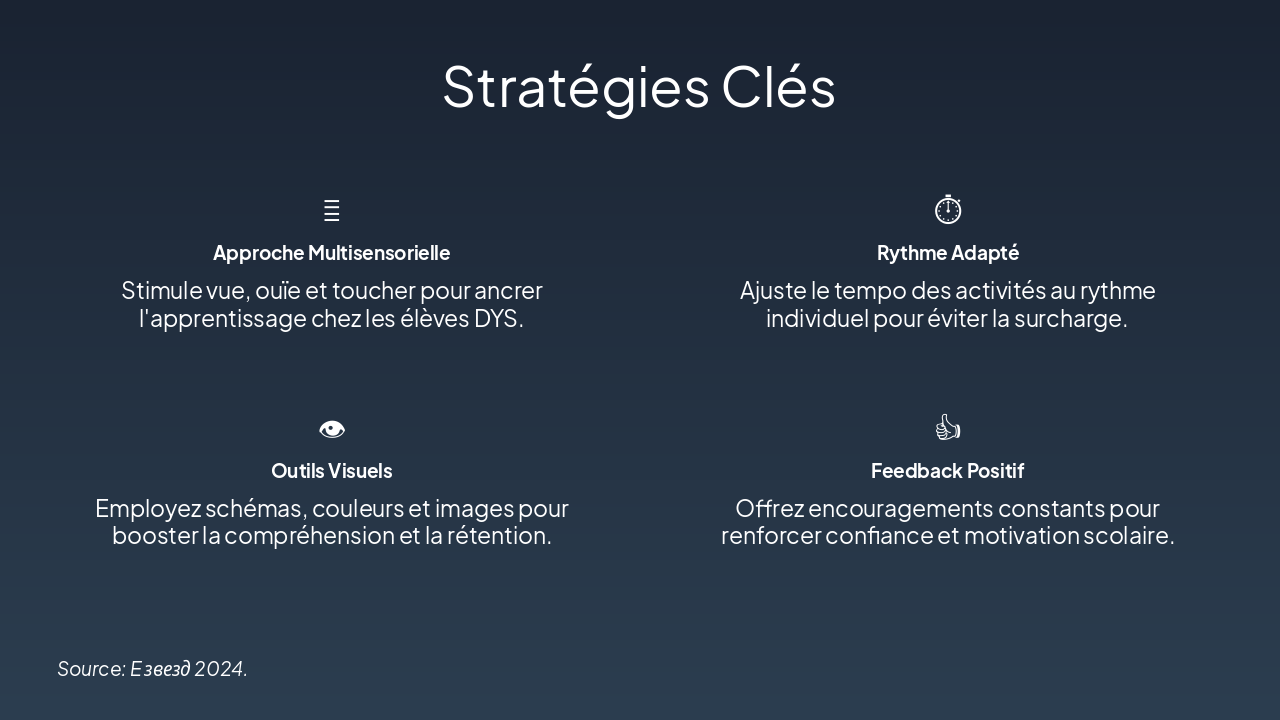 Présenter les stratégies pédagogiques clés pour soutenir les élèves avec troubles DYS : approche multisensorielle, rythme adapté, outils visuels et feedback positif.