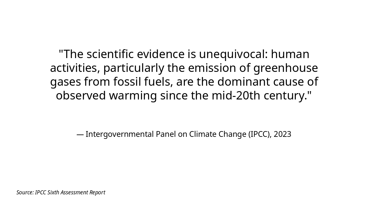 > The scientific evidence is unequivocal: human activities, particularly the emission of greenhouse gases from fossil fuels, are the dominant cause of observed warming since the mid-20th century.