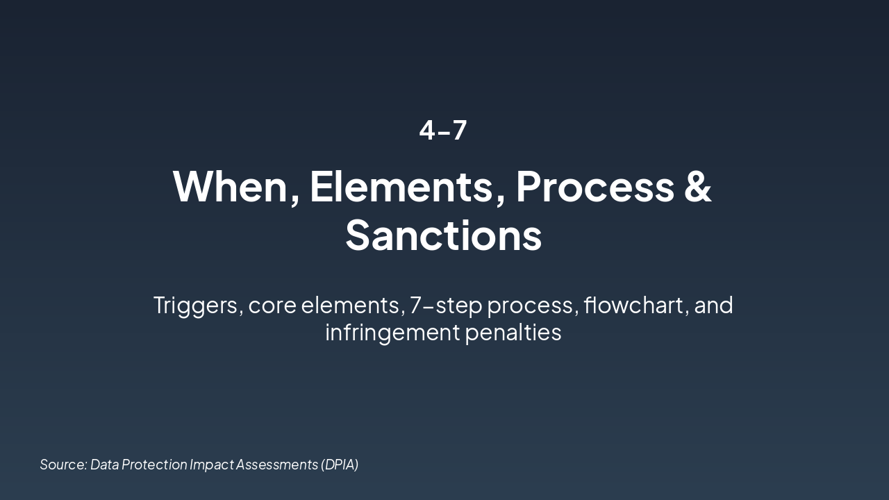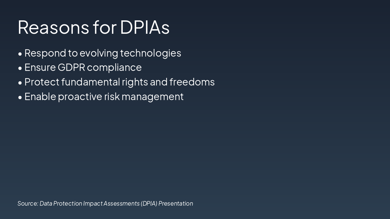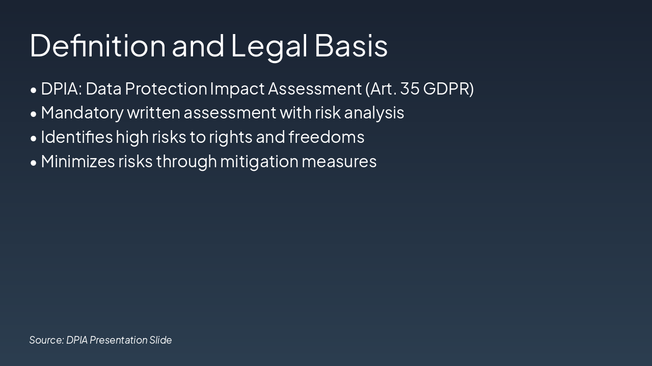 This title slide introduces "Data Protection Impact Assessments (DPIA)" as its main topic. It describes DPIA as an essential GDPR tool for ensuring compliance in high-risk data processing.
