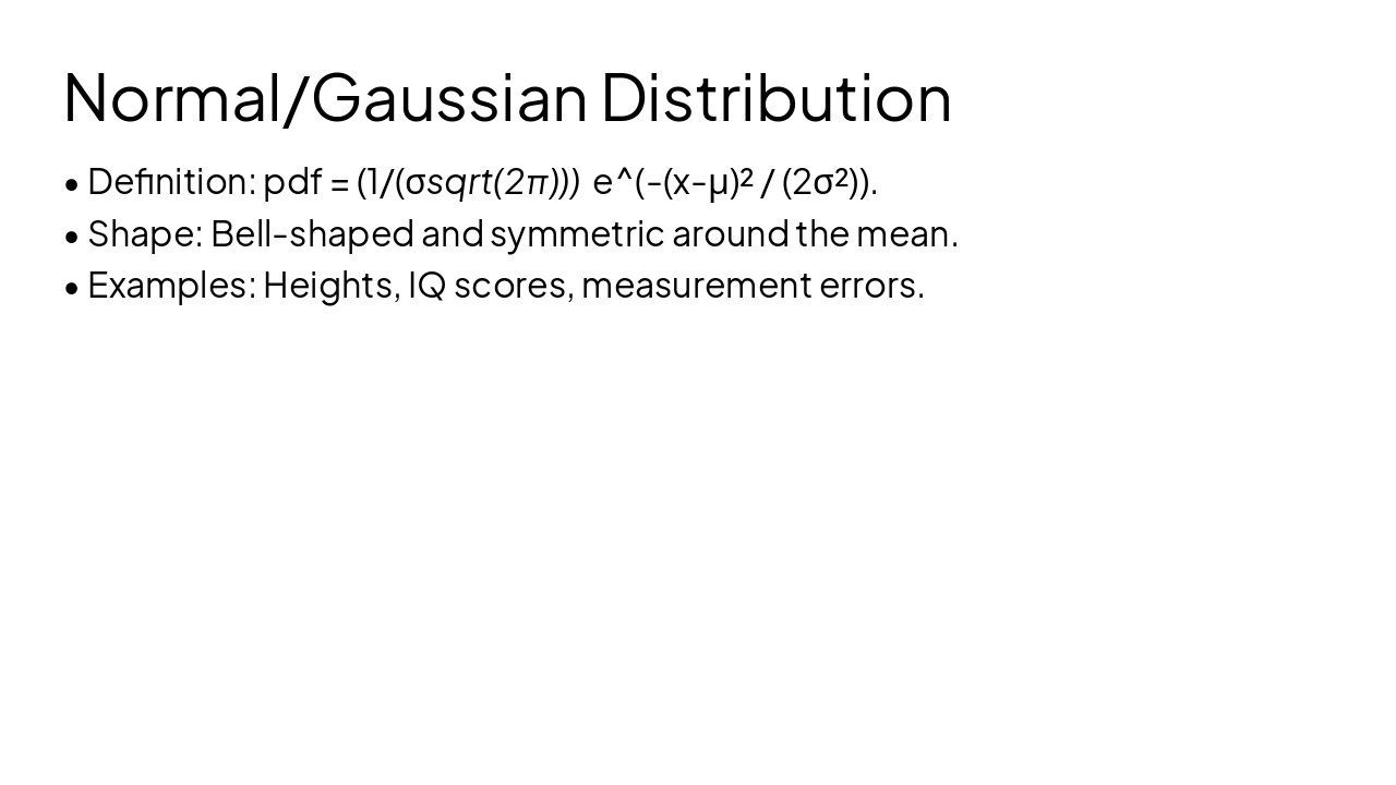 Create a PowerPoint presentation titled 'Probability Theory and Random Variables'. Use the provided slide structure exactly and do not remove any content. Slides: 1 Introduction to Probability Theory with definition, probability scale (0 impossible,1 certain), rule sum=1. 2 Real World Applications: weather forecasting, insurance risk, networks/systems reliability, poll management. 3 Random Experiment definition, conditions (multiple outcomes, unpredictable), examples coin/die, defective bolts, bulb lifetime 0<t<4000. 4 Sample Space and Events with examples coin S={H,T}, die S={1..6}, sample point, event subset example two coins only one head. 5 Types of Events: sure event S, impossible event empty set example rolling 7, simple event example exactly 3 on die, compound event at least one head in three tosses. 6 Bayes Theorem (heading only). 7 Random Variable definition, purpose, representation X,Y,Z; example two coin toss mapping HH->2 HT->1 TH->1 TT->0 range {0,1,2}. 8 Mapping S to R with X:S→R; examples die mapping and two coins mapping to number of heads. 9 Examples of Random Variables: heads in 3 tosses, customers per hour, bulb lifespan, defective items among 10. 10 Discrete Random Variable definition, countable values, examples students in class, telephone calls, number of heads; mention binomial and poisson. 11 Continuous Random Variable definition, examples height, weight, temperature, race time; mention uniform and normal distributions. 12 Range of Random Variable with examples two coins {0,1,2} and sum of two dice {2..12}. 13 Probability Distribution Function for continuous variable with properties non‑negative, total area 1, probability as area; formula P(a≤X≤b)=∫ab f(x)dx. 14 Cumulative Distribution Function F(x)=P(X≤x) properties 0–1, non‑decreasing, limit→1; relation to PDF via integration. 15 Binomial Distribution criteria n trials, success p failure q=1-p independence; formula P(X=k)=C(n,k)p^k q^{n-k}. 16 Binomial example defective bolts n=4 p=0.10 find P(X=1)=4*(0.1)*(0.9)^3=0.2916 conclusion 29.16%. 17 Poisson (heading only). 18 Uniform Distribution definition f(x)=1/(b-a) for a≤x≤b and probability formula integral equals (x2-x1)/(b-a); examples bus waiting time 0–10 min and random point on 1m ruler. 19 Mean and Variance of Uniform μ=(a+b)/2 variance (b-a)^2/12 explanation midpoint and interval length. 20 Problems Uniform: X uniform -2 to 6 mean=2 variance=64/12; P(X<4)=6/8; P(X>0)=6/8=3/4. Problem2 uniform 8–20 mean14 variance12; P(|X−6|≤15)=1; P(15≤X≤17)=1/6. 21 Normal/Gaussian Distribution definition with pdf (1/(σ√(2π)))e^{-(x-μ)^2/(2σ^2)}, bell shaped symmetric; examples heights IQ measurement errors. 22 Standard Normal Distribution Z=(X-μ)/σ Z~N(0,1) pdf φ(z)=(1/√(2π))e^{-z^2/2} purpose universal table. 23 Area Under Normal Curve properties total area1; P(μ−σ<X<μ+σ)=0.6826 explanation using Z. 24 Standard Normal Table how to use steps and examples Z=1.00 area0.3413 Z=1.96 area≈0.4750. 25 Comparison Uniform vs Normal example uniform(8,20) P(15≤X≤17)=1/6≈0.1667 vs normal μ=14 σ²=12 giving ≈0.1937 conclusion different shapes different probabilities. Design: academic clean theme, clear headings, math formatted, include simple diagrams where relevant (bell curve, uniform line).