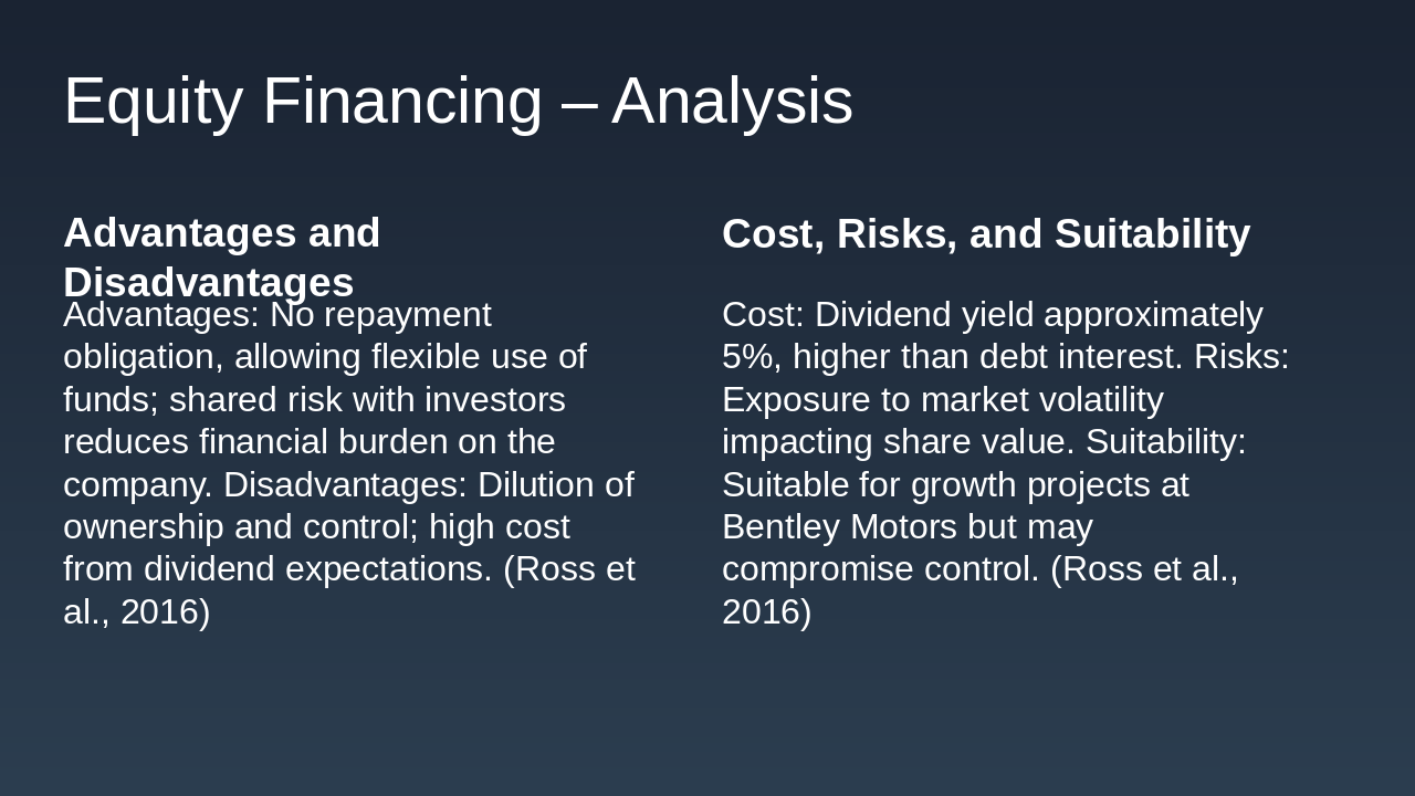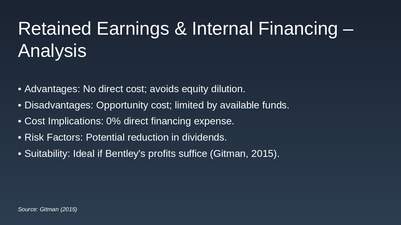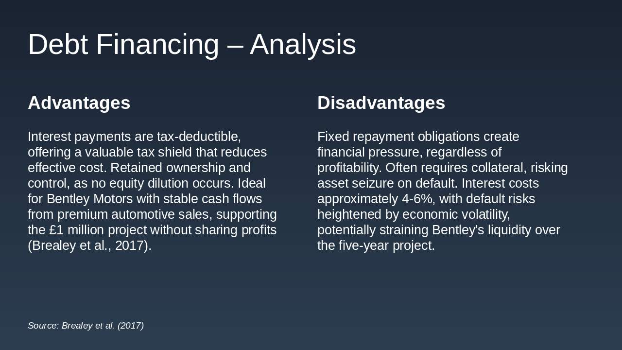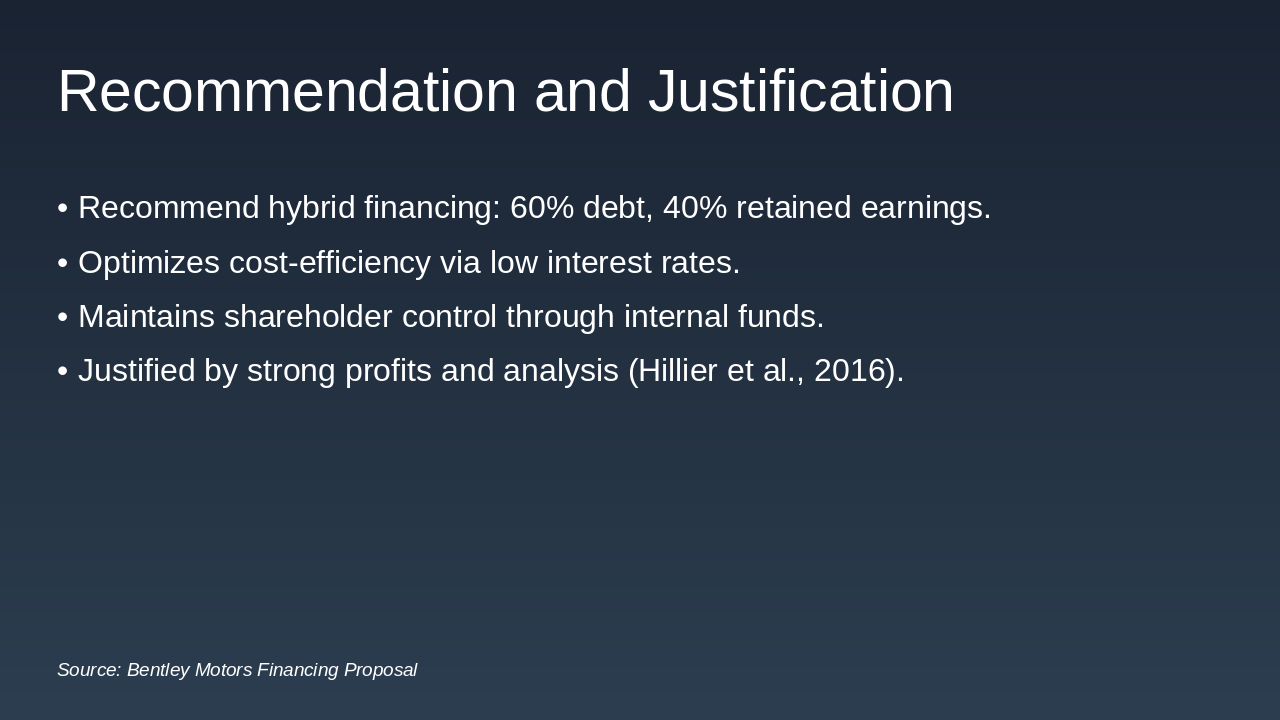 Closing message: Thank you for your attention. (4 words) Call-to-action: Approve the financing proposal to drive Bentley's innovation forward. (8 words) Summarize key benefits: The recommended hybrid financing approach (debt and retained earnings) optimizes costs, reduces risks, and aligns with Bentley's strategic goals, ensuring sustainable growth over the five-year project.