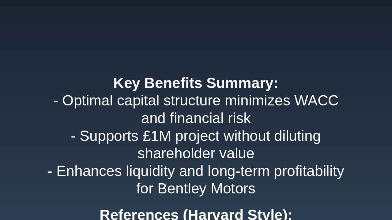The conclusion slide summarizes the key benefits of an optimal capital structure, which minimizes weighted average cost of capital (WACC) and financial risk, supports a £1M project without diluting shareholder value, and enhances liquidity and long-term profitability for Bentley Motors. It also lists references in Harvard style from prominent corporate finance textbooks, including works by Arnold, Brealey et al., and Ross et al.