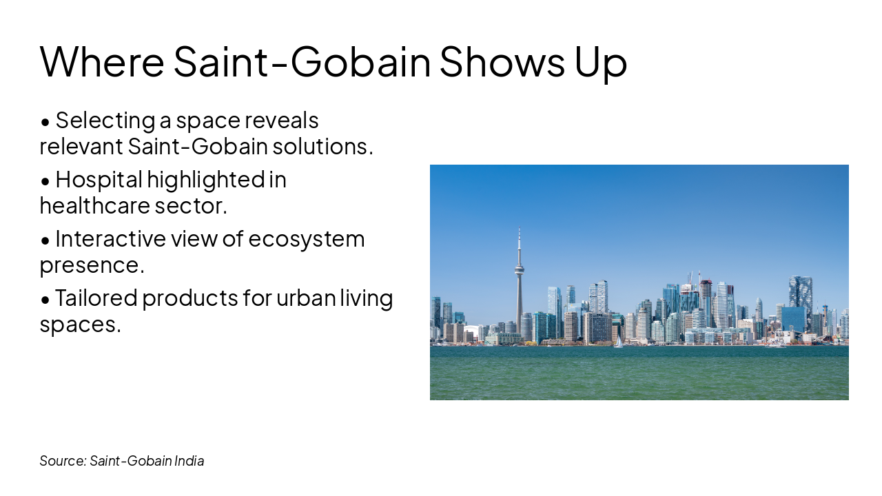 Cityscape with mobility area (car/metro) highlighted. Side panel: Sekurit, Abrasives & Surface Solutions, Ceramics, Polymer Solutions.