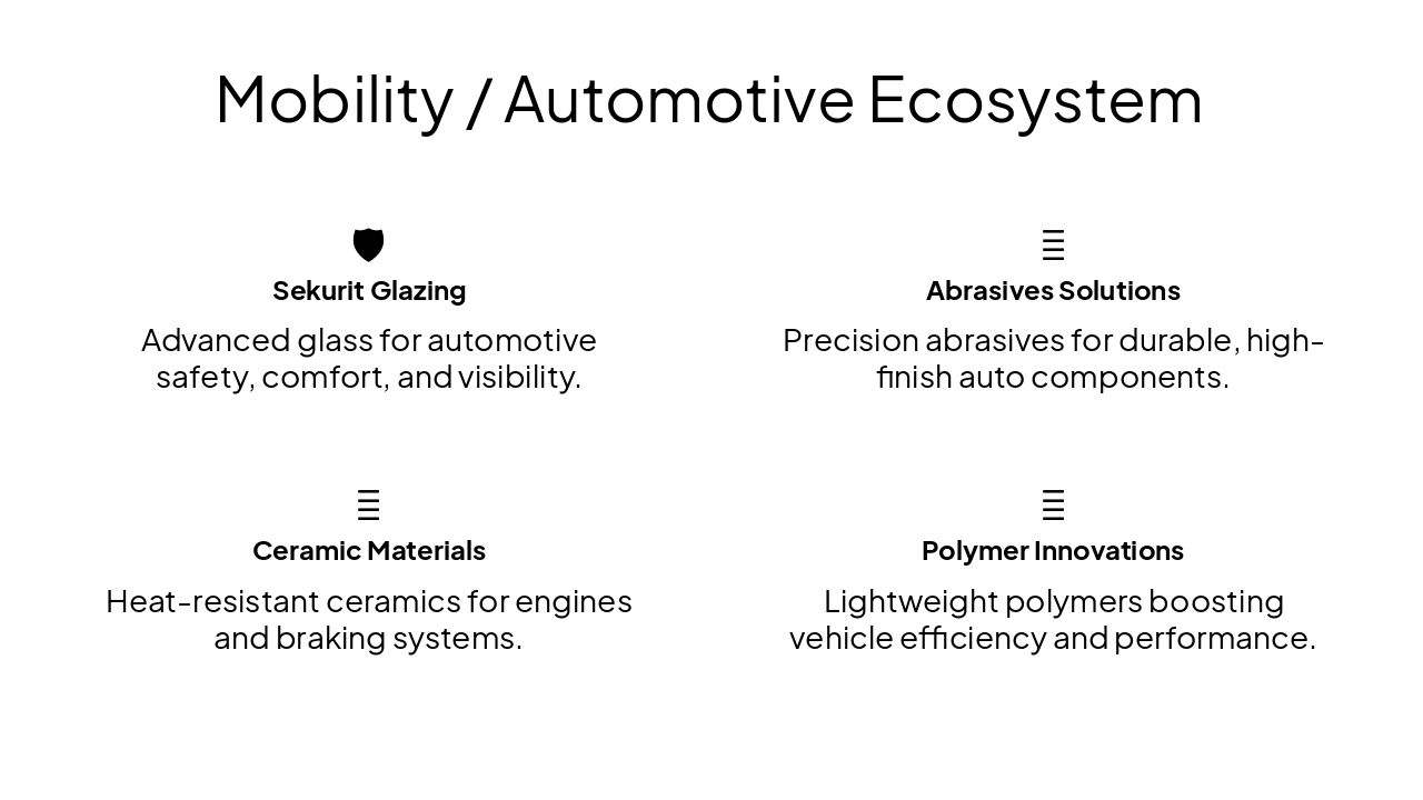 { "features": [ { "icon": "🛡️", "heading": "Sekurit Glazing", "description": "Advanced glass for automotive safety, comfort, and visibility." }, { "icon": "🔧", "heading": "Abrasives Solutions", "description": "Precision abrasives for durable, high-finish auto components." }, { "icon": "🔥", "heading": "Ceramic Materials", "description": "Heat-resistant ceramics for engines and braking systems." }, { "icon": "🧪", "heading": "Polymer Innovations", "description": "Lightweight polymers boosting vehicle efficiency and performance." } ] }