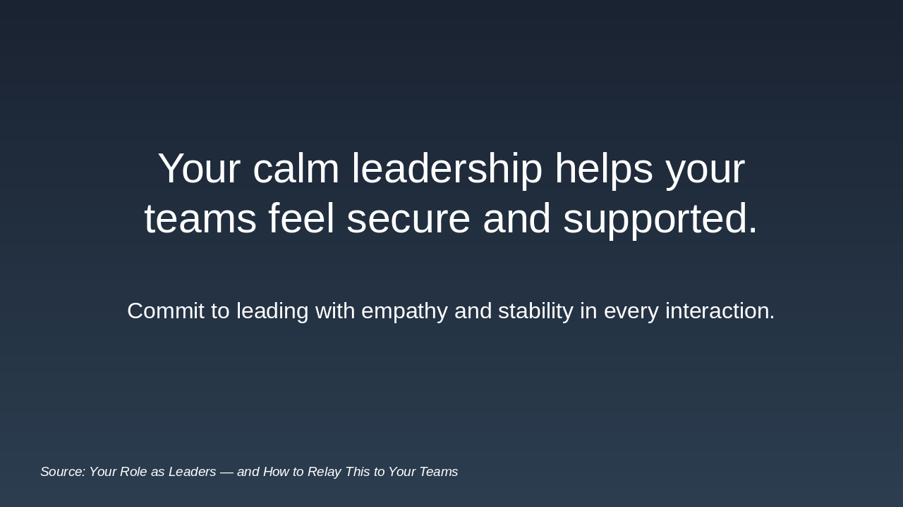 The slide's title emphasizes leaders' roles and strategies for communicating these to their teams. Its subtitle highlights the importance of conveying calm, clarity, and confidence in that process.