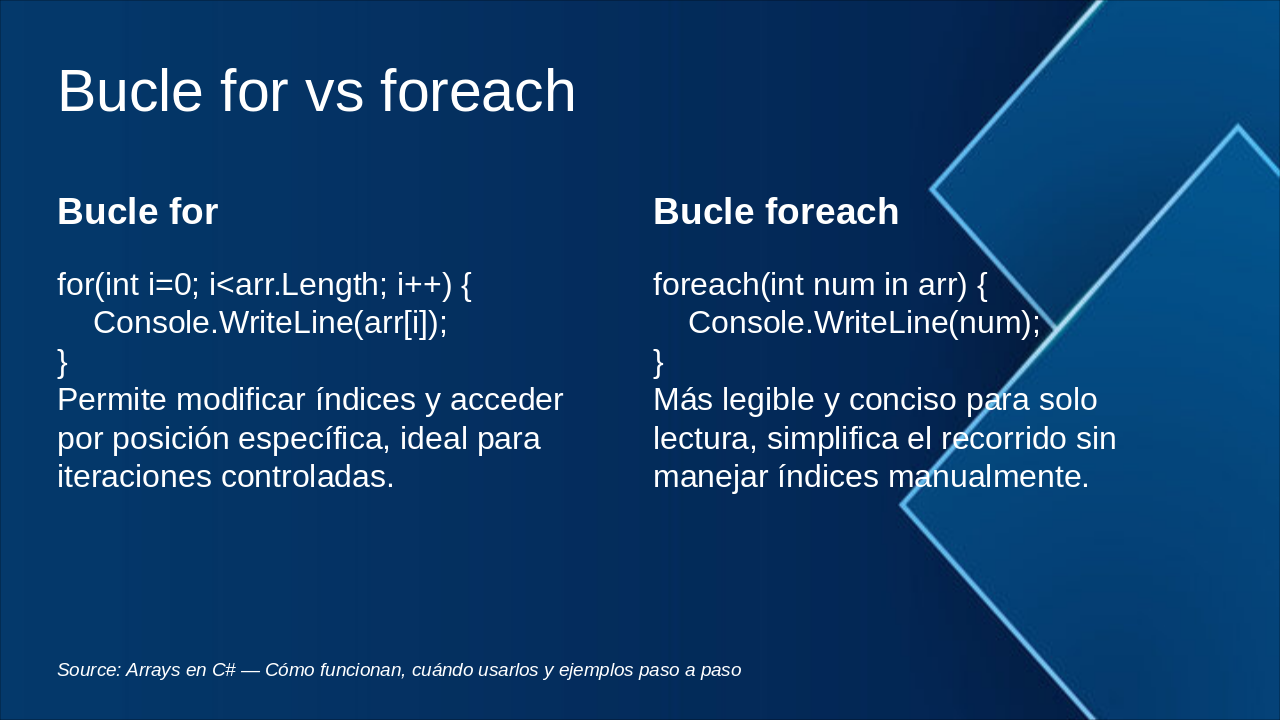 | for(int i=0; i<arr.Length; i++) { Console.WriteLine(arr[i]); } Permite modificar índices y acceder por posición específica, ideal para iteraciones controladas. | foreach(int num in arr) { Console.WriteLine(num); } Más legible y conciso para solo lectura, simplifica el recorrido sin manejar índices manualmente. |