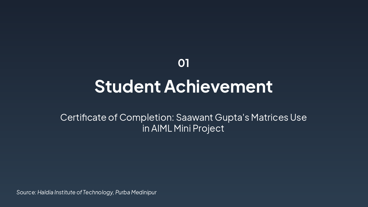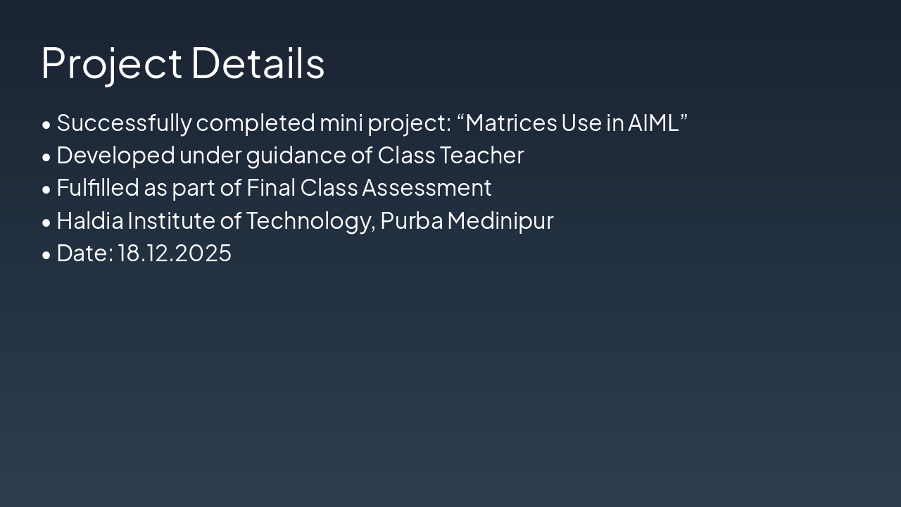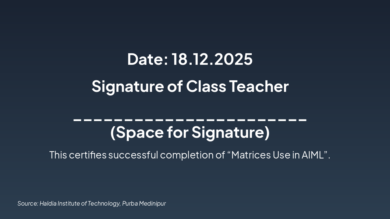 > This is to certify that Saawant Gupta (Roll No: 25/AIML/147), Department of Artificial Intelligence and Machine Learning (AIML), Haldia Institute of Technology, has successfully completed the mini project entitled “Matrices Use in AIML” under my guidance as a part of Final Class Assessment. Date: 18.12.2025