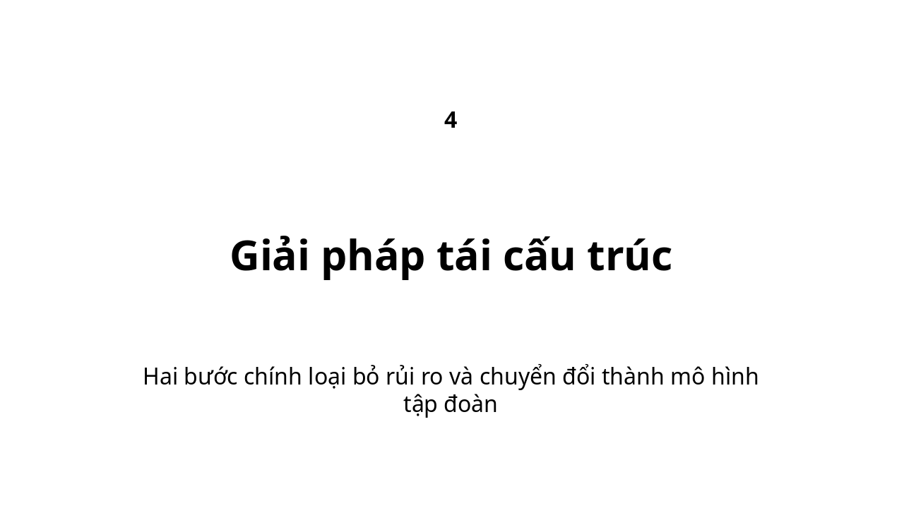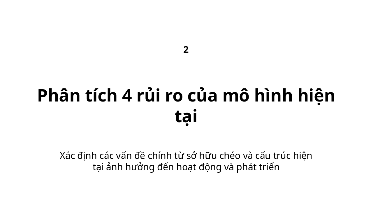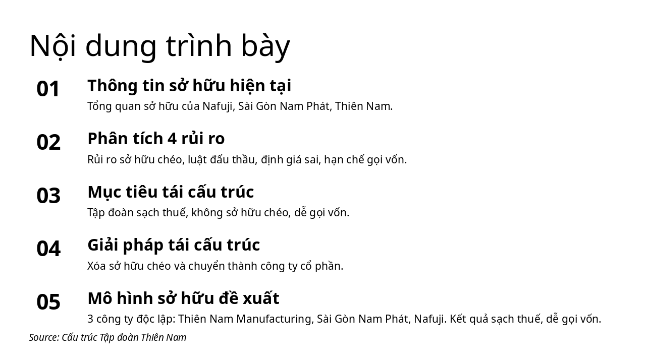 Bài trình bày gồm 5 phần: 1. Thông tin sở hữu hiện tại (3 công ty). 2. Phân tích 4 rủi ro. 3. Mục tiêu tái cấu trúc. 4. Giải pháp tái cấu trúc. 5. Mô hình sở hữu đề xuất và kết quả.