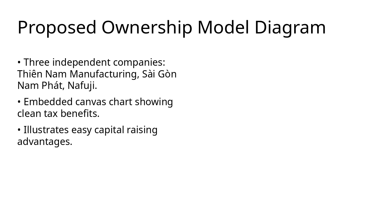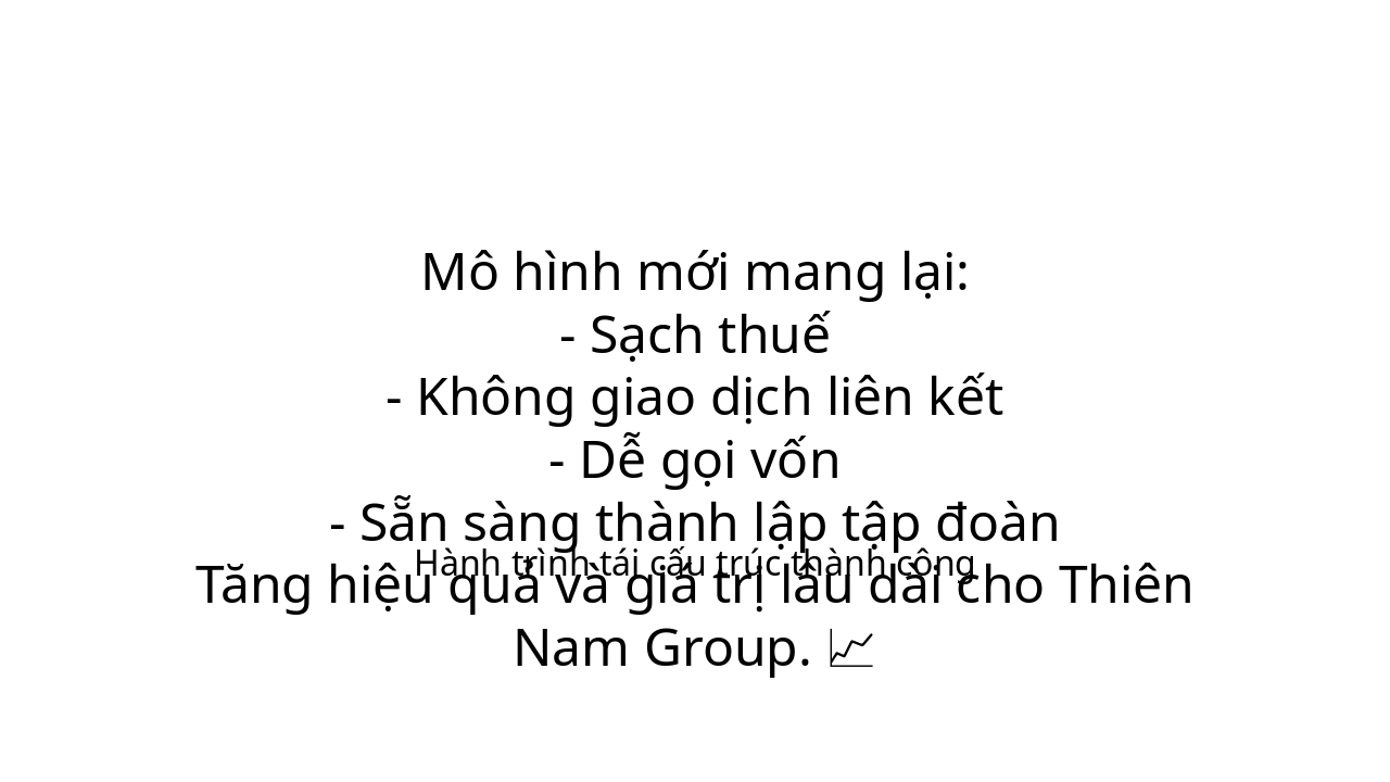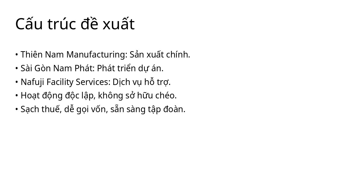 3 công ty độc lập: Thiên Nam Manufacturing, Sài Gòn Nam Phát, Nafuji. Kết quả sạch thuế, dễ gọi vốn. Source: Cấu trúc Tập đoàn Thiên Nam