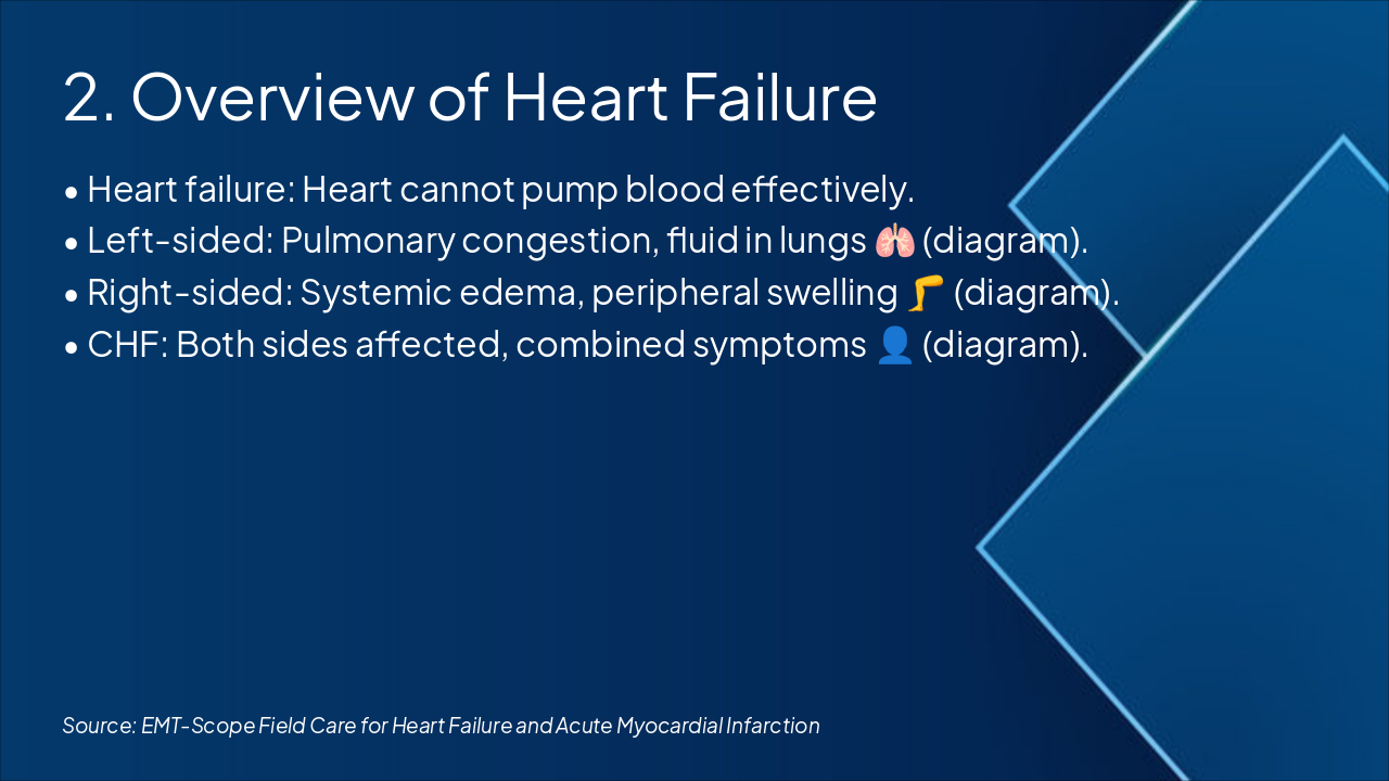 Highlight key signs like dyspnea and crackles. Stress EMT interventions: O2 and positioning. Note critical limitโno loop diuretics at BLS level. Use checkmarks for quick visual recall.
