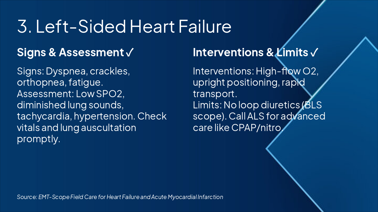The slide on Left-Sided Heart Failure outlines key signs like dyspnea, crackles, orthopnea, and fatigue, with assessments including low SpO2, diminished lung sounds, tachycardia, and hypertension via prompt vital checks and lung auscultation. Interventions emphasize high-flow oxygen, upright positioning, and rapid transport, while limiting BLS to no loop diuretics and requiring ALS for advanced care like CPAP or nitro.