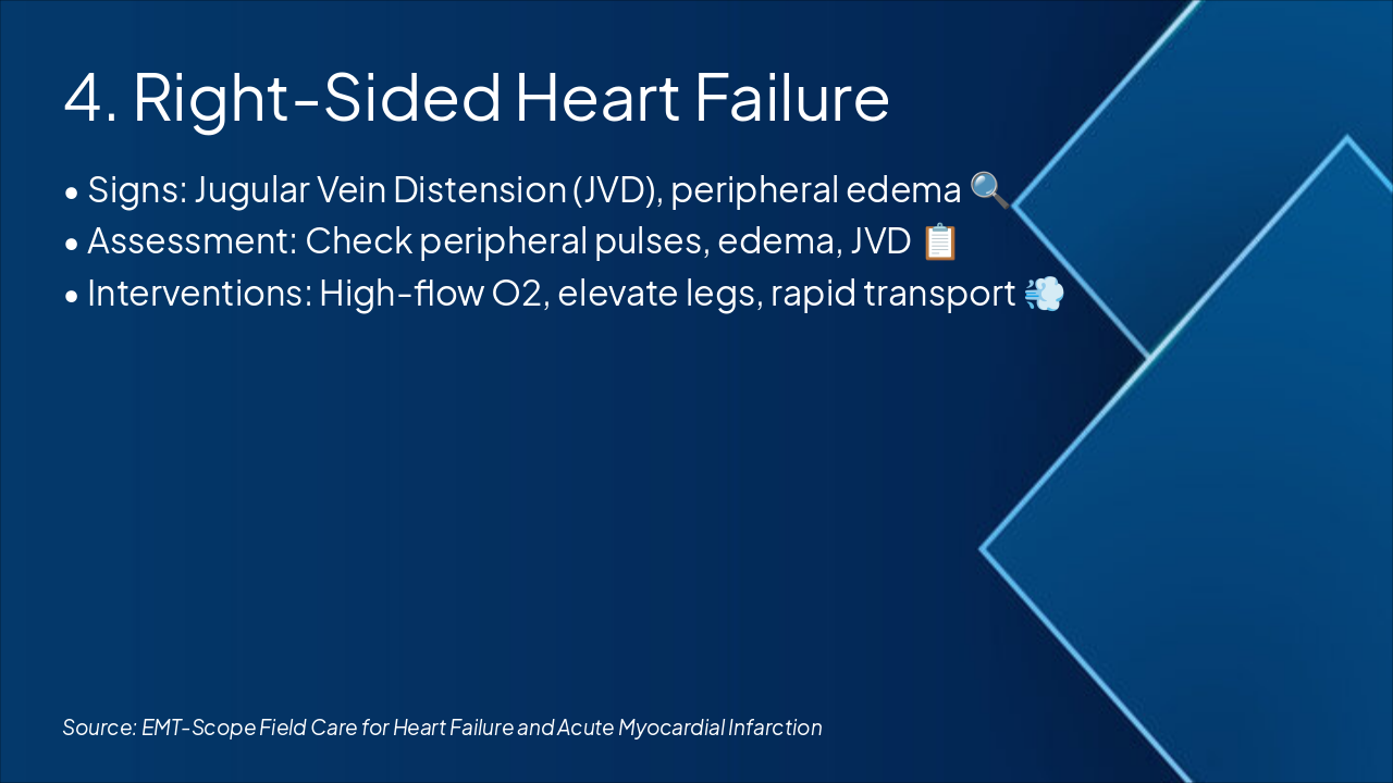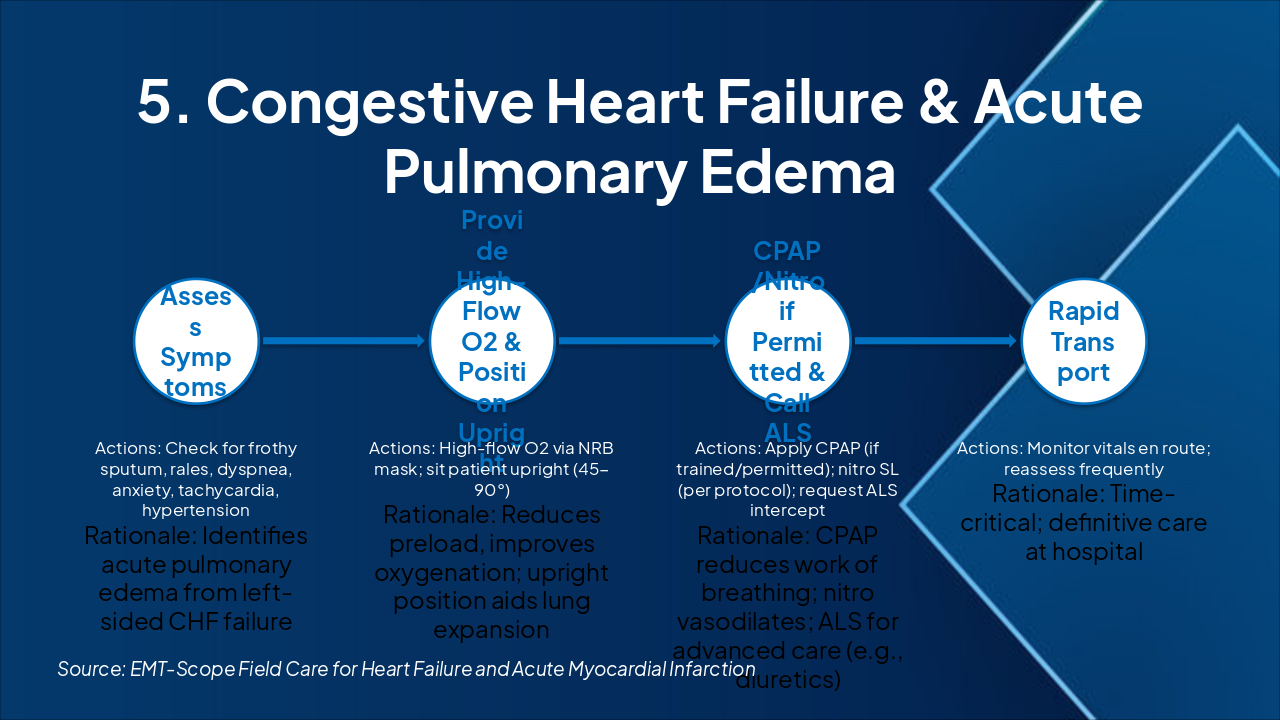 | Signs: Dyspnea, crackles, orthopnea, fatigue. Assessment: Low SPO2, diminished lung sounds, tachycardia, hypertension. Check vitals and lung auscultation promptly. | Interventions: High-flow O2, upright positioning, rapid transport. Limits: No loop diuretics (BLS scope). Call ALS for advanced care like CPAP/nitro. |