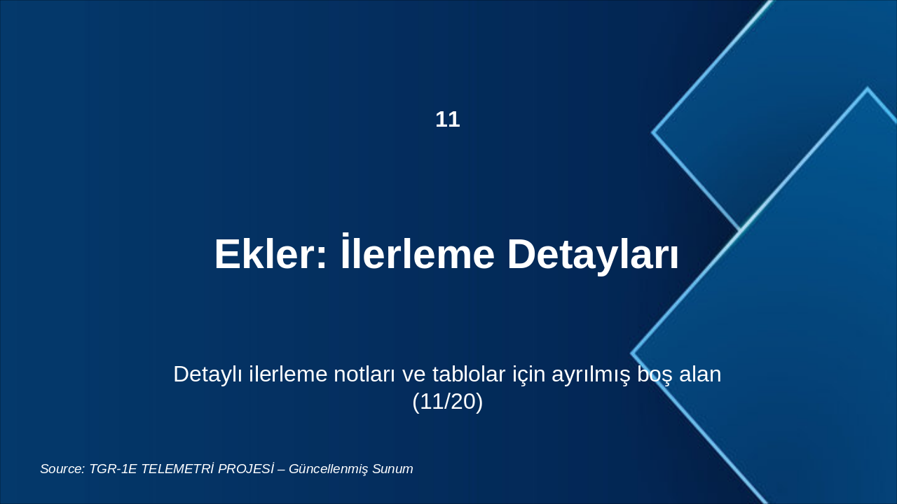 This slide serves as a section header titled "Ekler: İlerleme Detayları," marking it as section 11 out of 20 in the presentation. It provides a reserved blank space for including detailed progress notes and tables.