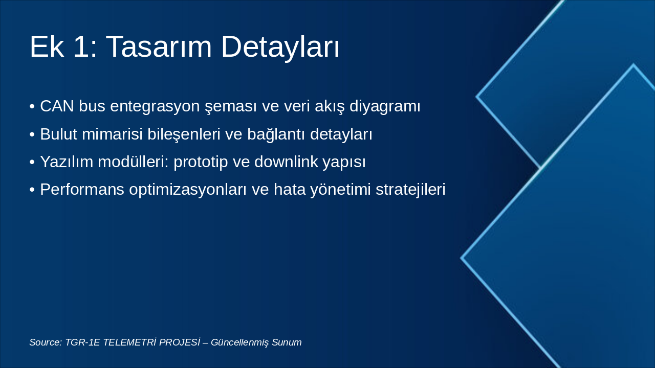 The slide "Ek 1: Tasarım Detayları" outlines key technical aspects of a system design, including the CAN bus integration schema and data flow diagram. It also covers cloud architecture components with connection details, software modules for prototyping and downlink structure, as well as performance optimizations and error management strategies.