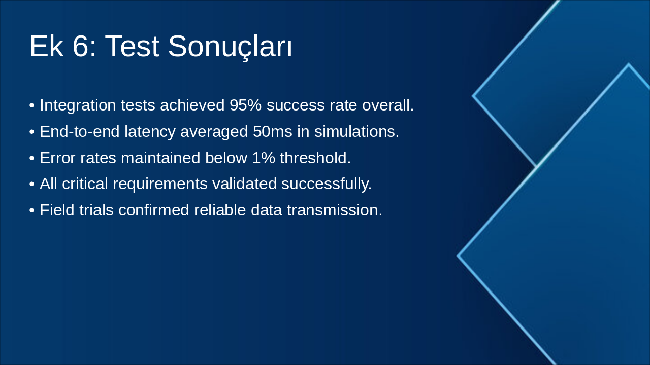 The slide presents test results from Ek 6, highlighting a 95% success rate in integration tests, an average end-to-end latency of 50ms in simulations, and error rates below 1%. It also confirms successful validation of all critical requirements and reliable data transmission in field trials.