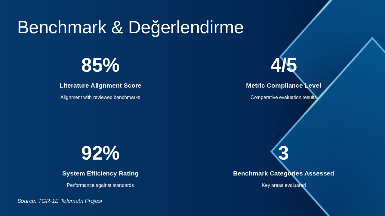 The slide presents key benchmarks and evaluation stats, including an 85% Literature Alignment Score for alignment with reviewed benchmarks and a 4/5 Metric Compliance Level from comparative evaluations. It also highlights a 92% System Efficiency Rating against standards and assessment across 3 benchmark categories.