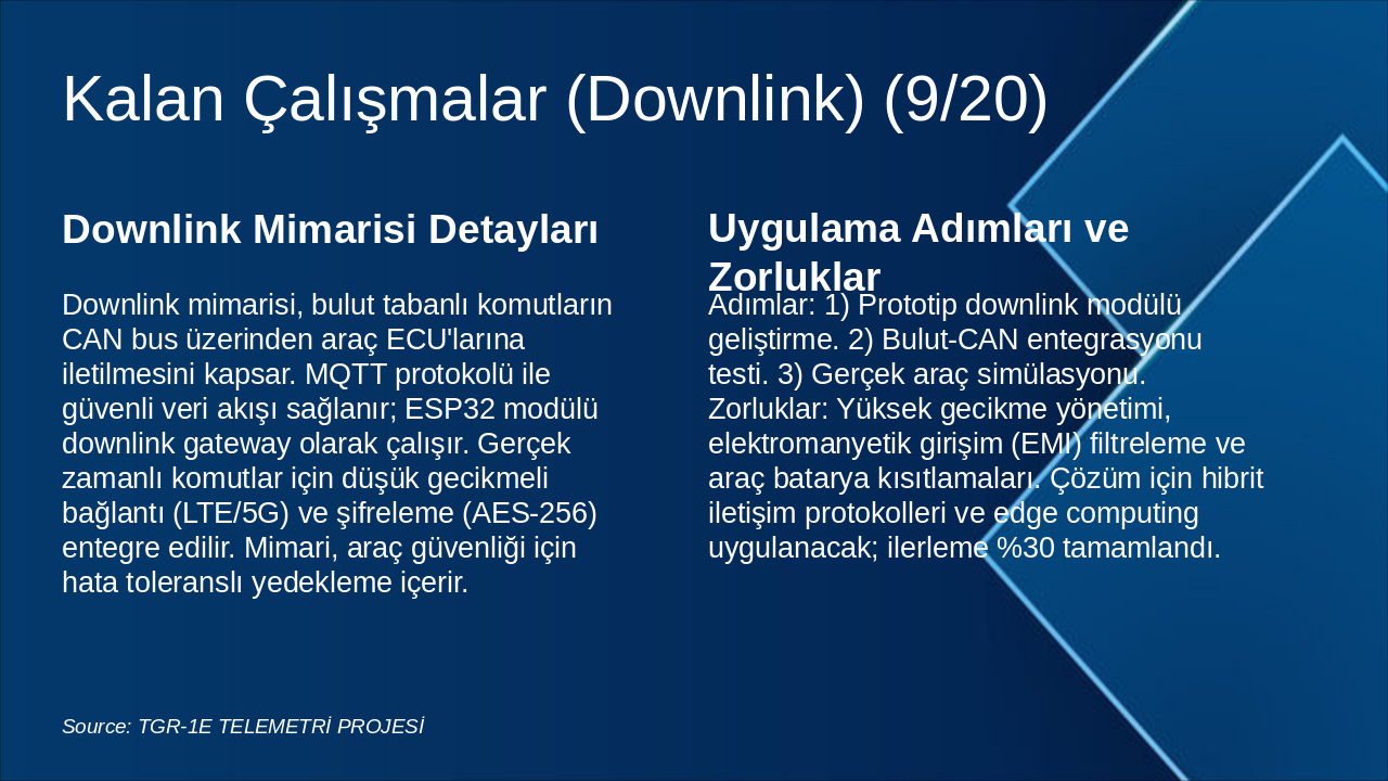 | Downlink mimarisi, bulut tabanlı komutların CAN bus üzerinden araç ECU'larına iletilmesini kapsar. MQTT protokolü ile güvenli veri akışı sağlanır; ESP32 modülü downlink gateway olarak çalışır. Gerçek zamanlı komutlar için düşük gecikmeli bağlantı (LTE/5G) ve şifreleme (AES-256) entegre edilir. Mimari, araç güvenliği için hata toleranslı yedekleme içerir. | Adımlar: 1) Prototip downlink modülü geliştirme. 2) Bulut-CAN entegrasyonu testi. 3) Gerçek araç simülasyonu. Zorluklar: Yüksek gecikme yönetimi, elektromanyetik girişim (EMI) filtreleme ve araç batarya kısıtlamaları. Çözüm için hibrit iletişim protokolleri ve edge computing uygulanacak; ilerleme %30 tamamlandı. |