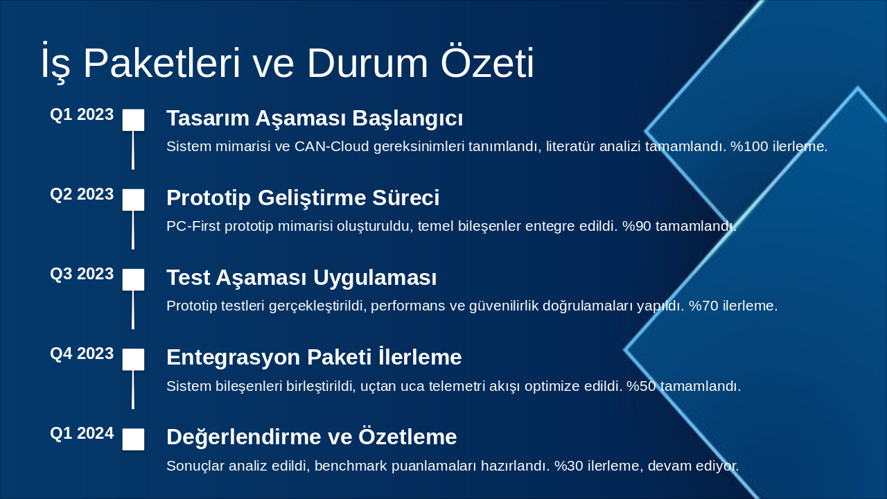 Q1 2023: Tasarım Aşaması Başlangıcı Sistem mimarisi ve CAN-Cloud gereksinimleri tanımlandı, literatür analizi tamamlandı. %100 ilerleme. Q2 2023: Prototip Geliştirme Süreci PC-First prototip mimarisi oluşturuldu, temel bileşenler entegre edildi. %90 tamamlandı. Q3 2023: Test Aşaması Uygulaması Prototip testleri gerçekleştirildi, performans ve güvenilirlik doğrulamaları yapıldı. %70 ilerleme. Q4 2023: Entegrasyon Paketi İlerleme Sistem bileşenleri birleştirildi, uçtan uca telemetri akışı optimize edildi. %50 tamamlandı. Q1 2024: Değerlendirme ve Özetleme Sonuçlar analiz edildi, benchmark puanlamaları hazırlandı. %30 ilerleme, devam ediyor.