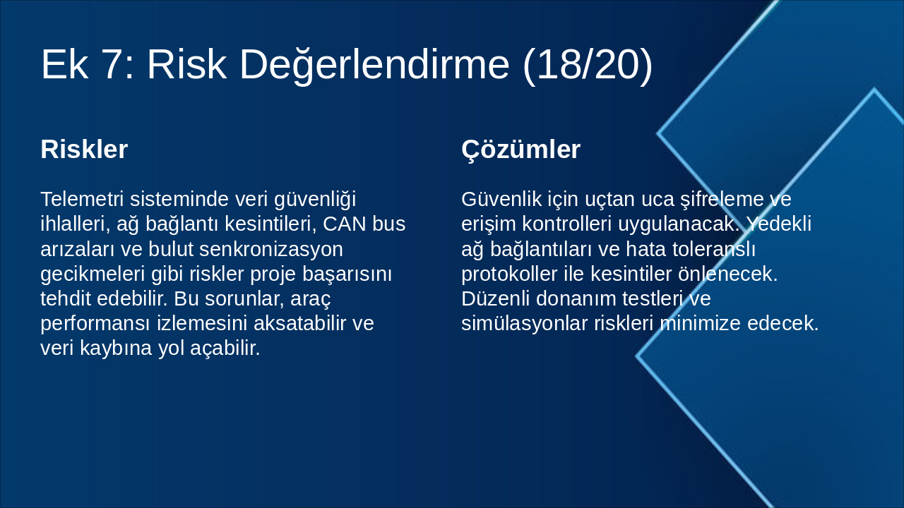 | Telemetri sisteminde veri güvenliği ihlalleri, ağ bağlantı kesintileri, CAN bus arızaları ve bulut senkronizasyon gecikmeleri gibi riskler proje başarısını tehdit edebilir. Bu sorunlar, araç performansı izlemesini aksatabilir ve veri kaybına yol açabilir. | Güvenlik için uçtan uca şifreleme ve erişim kontrolleri uygulanacak. Yedekli ağ bağlantıları ve hata toleranslı protokoller ile kesintiler önlenecek. Düzenli donanım testleri ve simülasyonlar riskleri minimize edecek. |