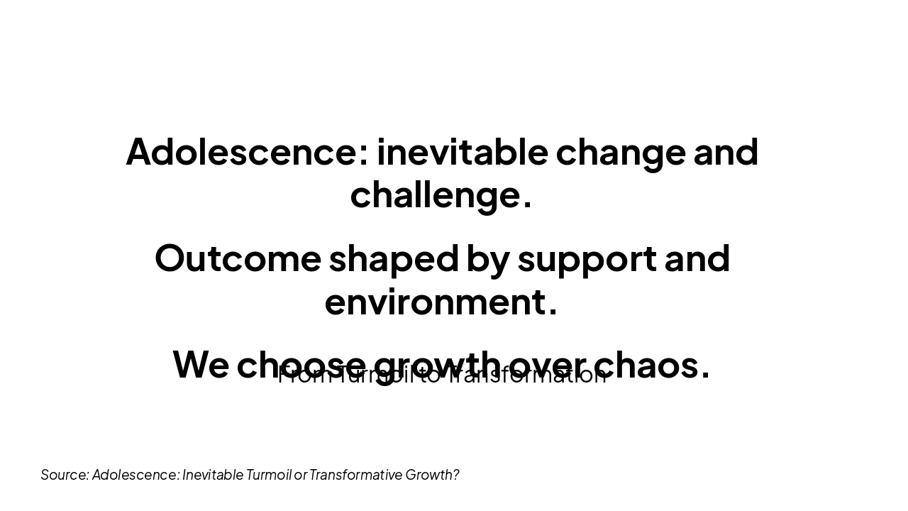 The title slide questions whether adolescence represents inevitable turmoil or transformative growth. Its subtitle explores these concepts of turmoil versus growth in teens.