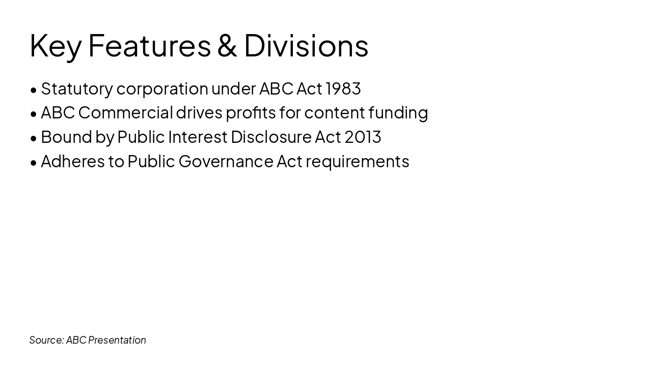 1932: Radio Beginnings ABC launches radio broadcasting, establishing foundational presence in Australian media. 1956: Television Launch ABC introduces TV services, expanding to visual storytelling and national coverage. 1983: ABC Act Charter Legislation formalizes ABC's charter, defining public service role and independence. 2000s: Digital Expansion ABC embraces online platforms, streaming, and digital content for modern audiences. 2013: Governance Acts New acts update governance, enhancing accountability and operational frameworks.