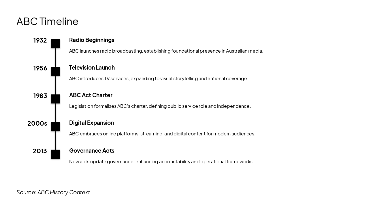 The ABC Timeline outlines key milestones in Australian Broadcasting Corporation's history, starting with radio beginnings in 1932 and television launch in 1956. It continues with the ABC Act Charter in 1983, digital expansion in the 2000s, and governance updates in 2013.