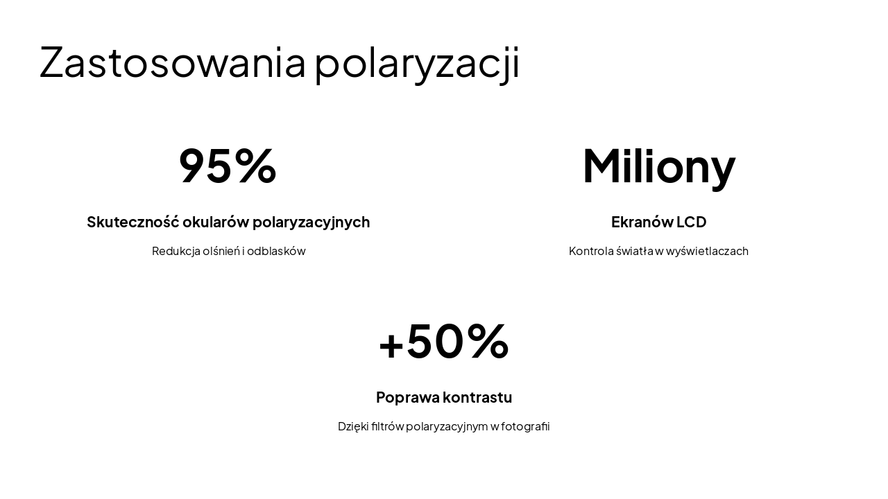 Slajd przedstawia kluczowe zastosowania polaryzacji, wskazując na 95% skuteczność okularów polaryzacyjnych w redukcji olśnień i odblasków. Podkreśla również użycie polaryzacji w milionach ekranów LCD do kontroli światła oraz poprawę kontrastu o ponad 50% dzięki filtrom w fotografii.