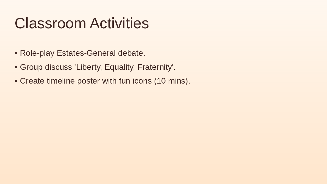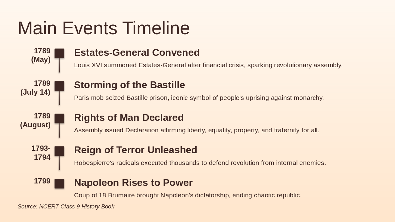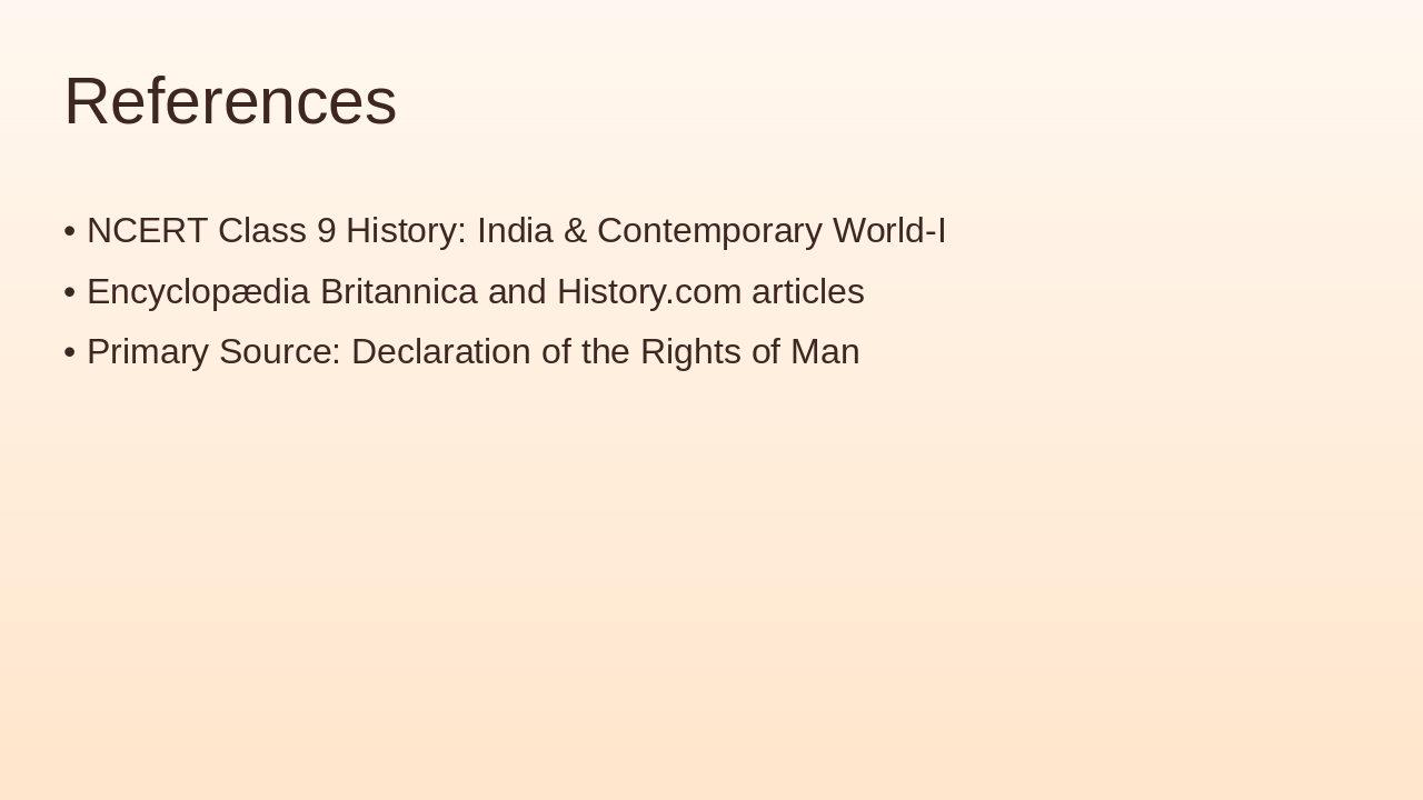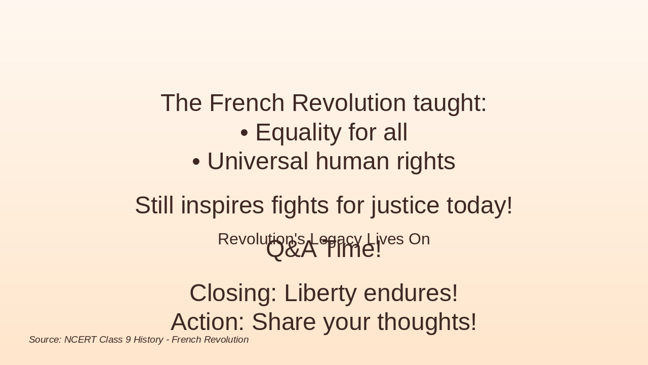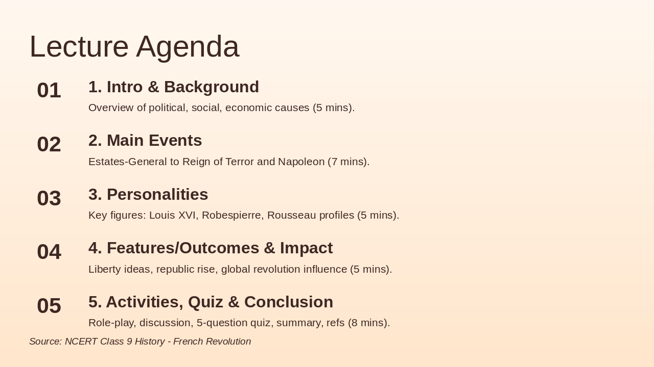 Role-play, discussion, 5-question quiz, summary, refs (8 mins). Source: NCERT Class 9 History - French Revolution
