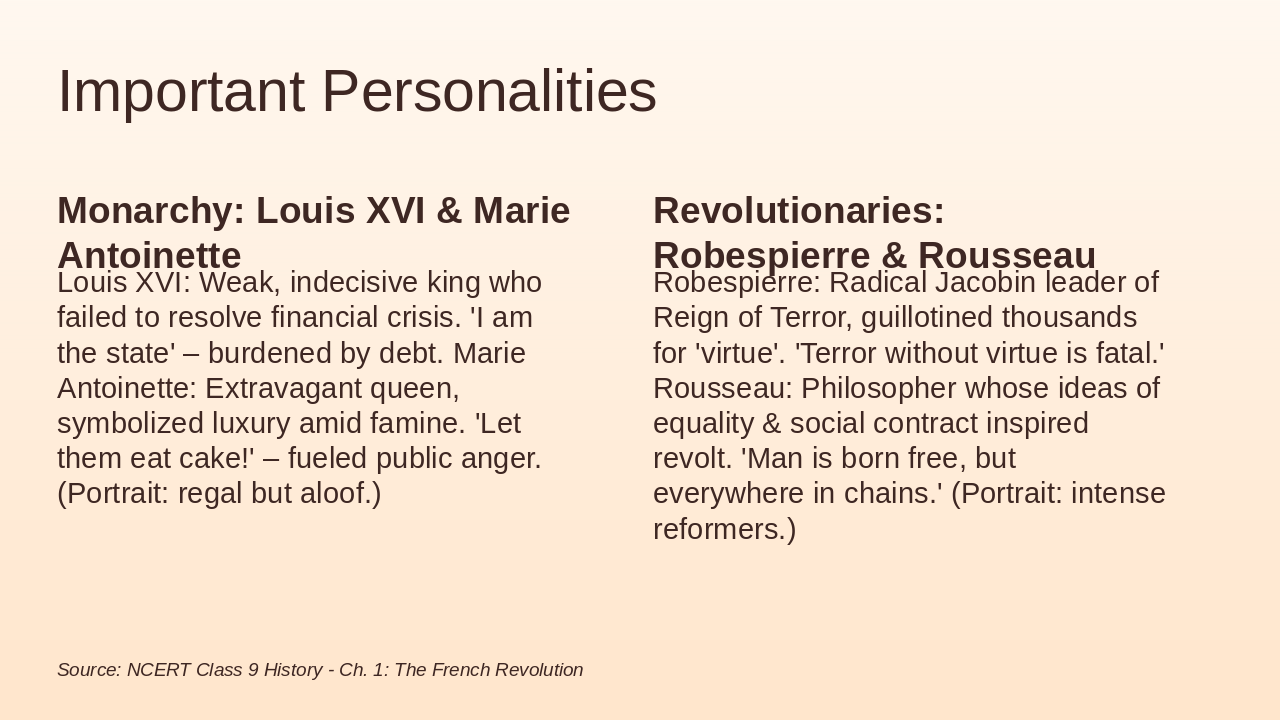 Key figures: Louis XVI, Robespierre, Rousseau profiles (5 mins).