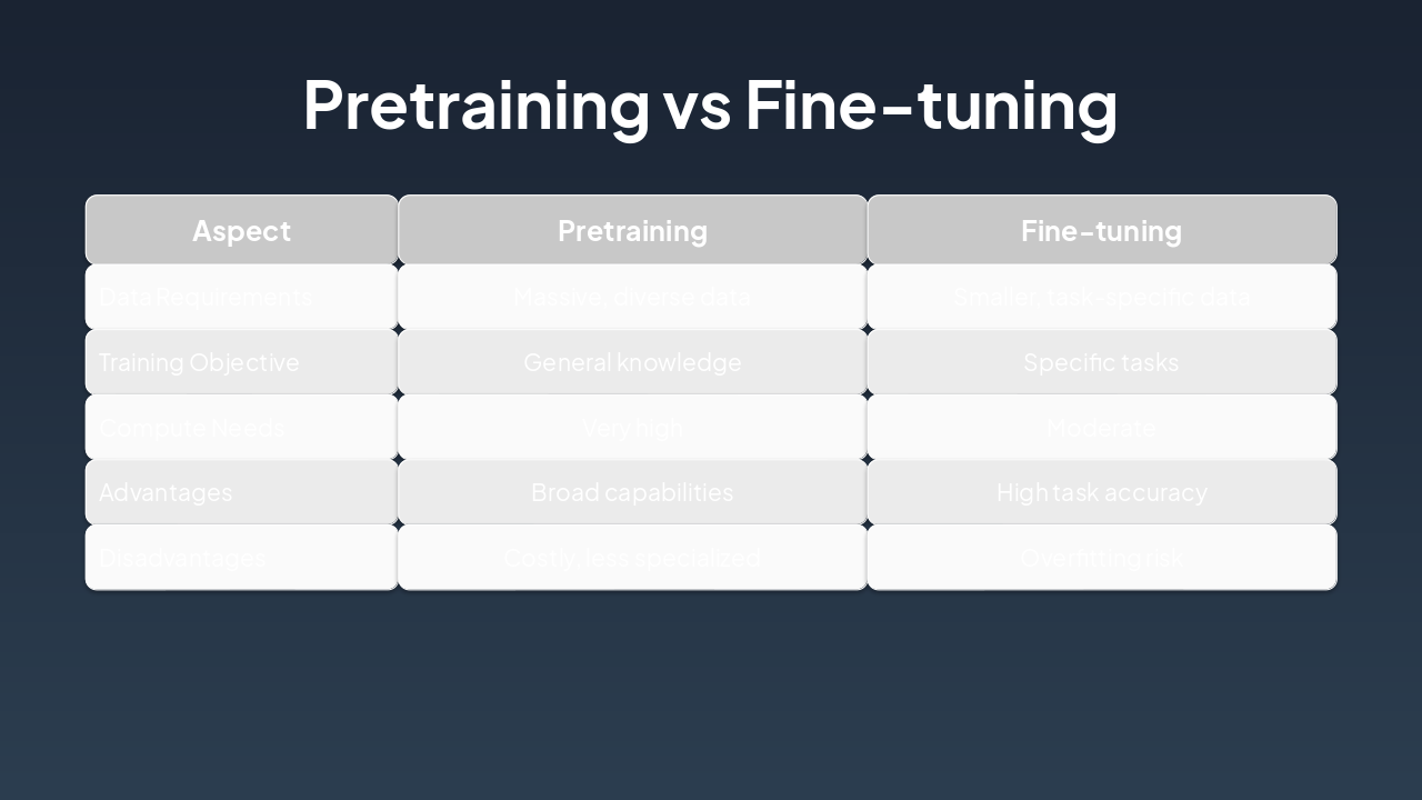 { "headers": [ "Aspect", "Pretraining", "Fine-tuning" ], "rows": [ [ "Data Requirements", "Massive, diverse data", "Smaller, task-specific data" ], [ "Training Objective", "General knowledge", "Specific tasks" ], [ "Compute Needs", "Very high", "Moderate" ], [ "Advantages", "Broad capabilities", "High task accuracy" ], [ "Disadvantages", "Costly, less specialized", "Overfitting risk" ] ] }