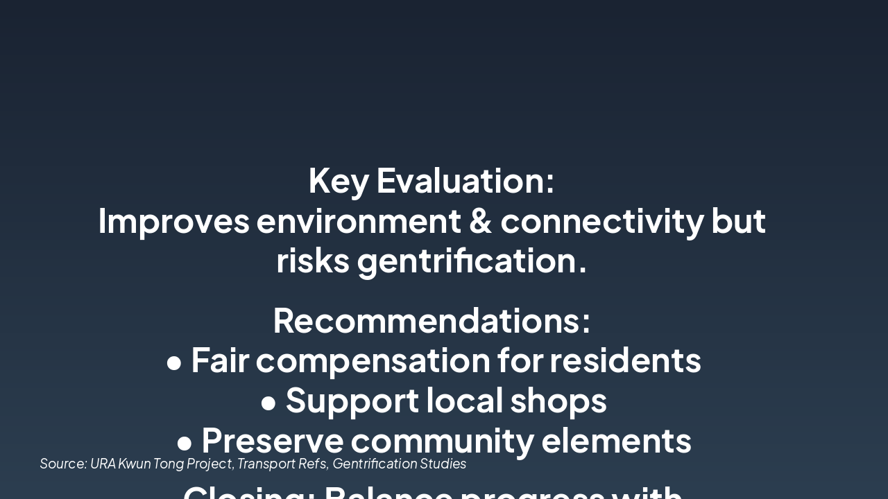Improves environment/connectivity but risks gentrification. Recommendations: Fair compensation, support shops, preserve community.