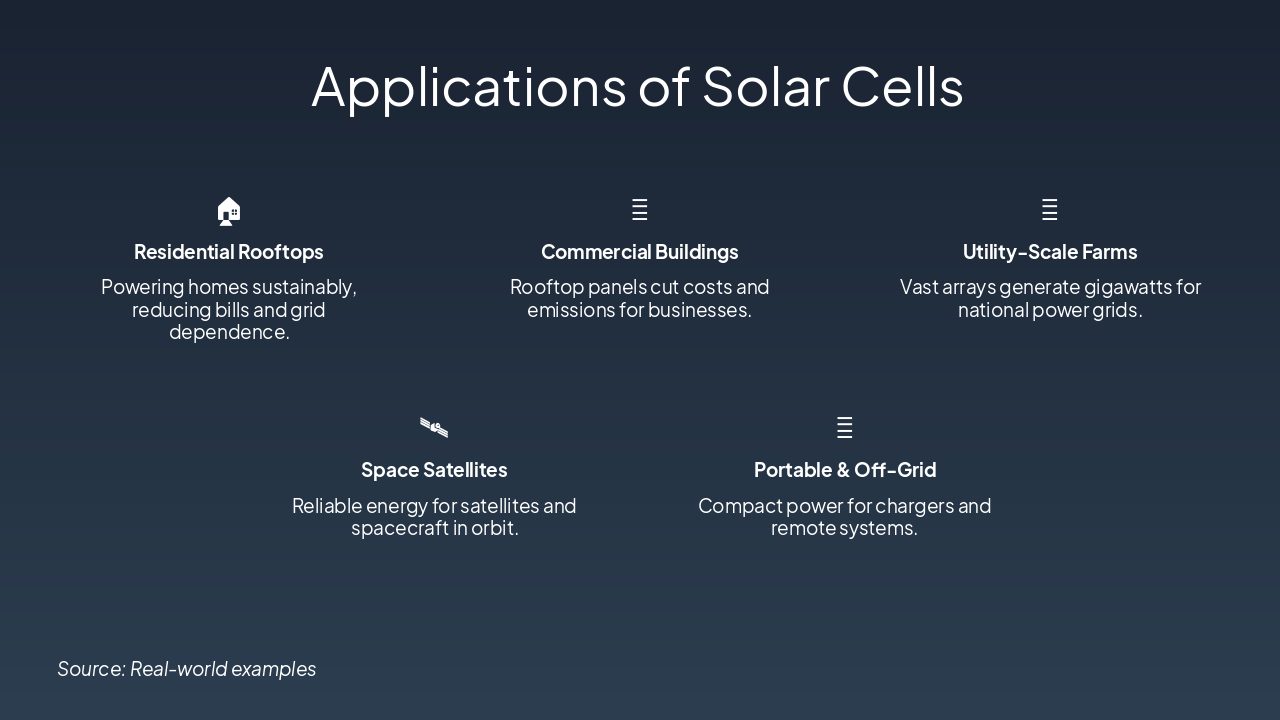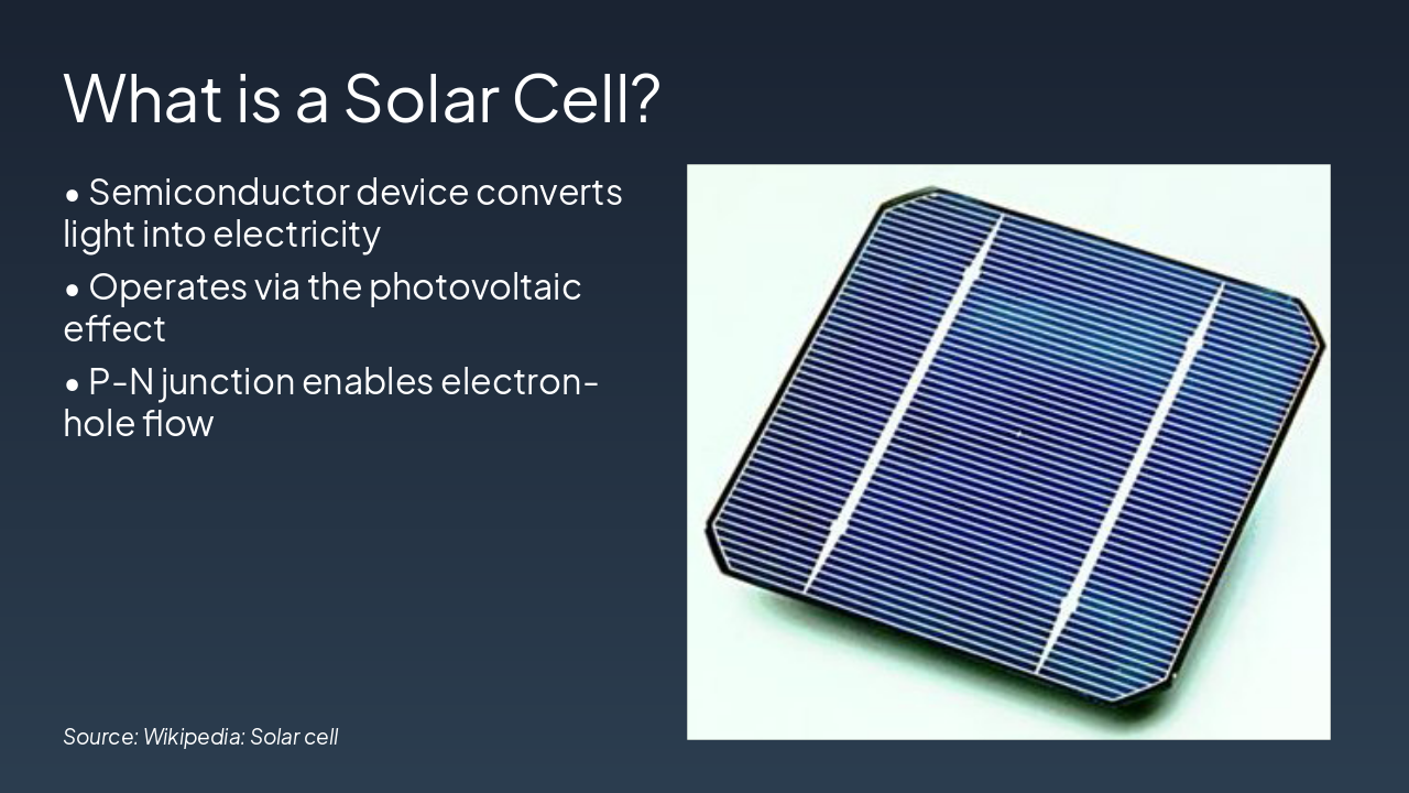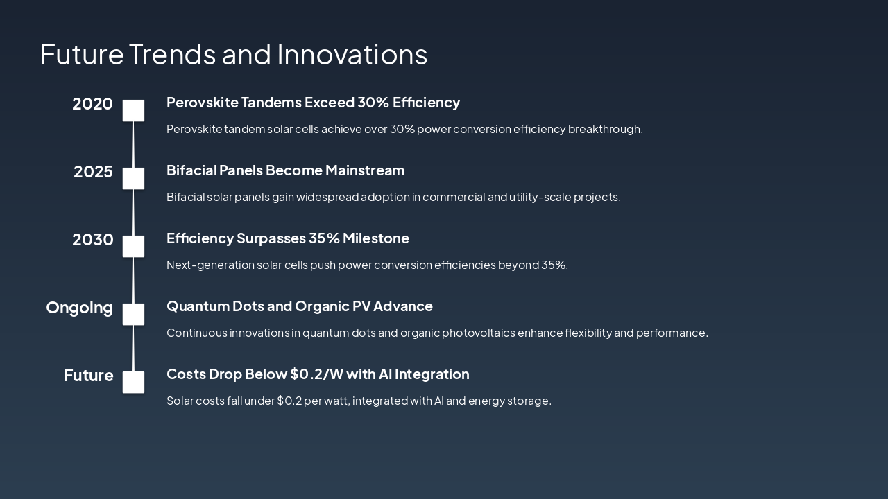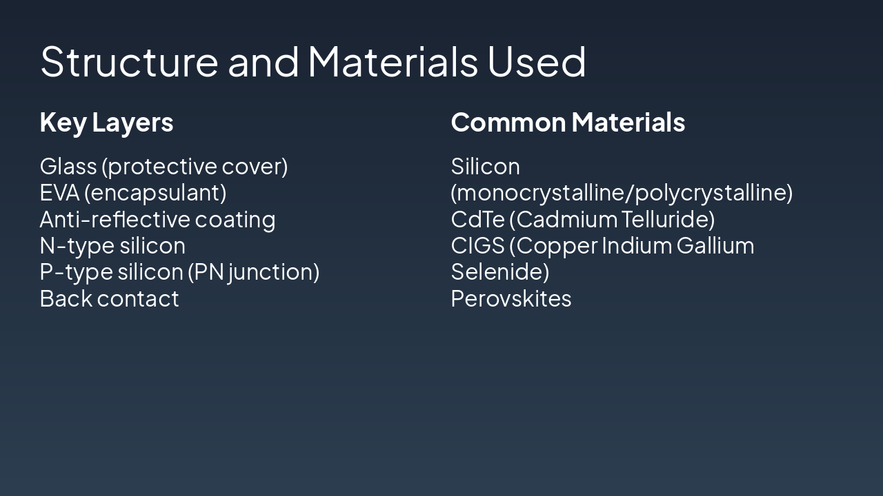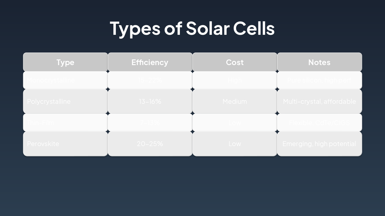 { "headers": [ "Type", "Efficiency", "Cost", "Notes" ], "rows": [ [ "Monocrystalline", "15-22%", "High", "Pure silicon, high perf" ], [ "Polycrystalline", "13-16%", "Medium", "Multi-crystal, affordable" ], [ "Thin-Film", "7-13%", "Low", "Flexible, CdTe/CIGS" ], [ "Perovskite", "20-25%", "Low", "Emerging, high potential" ] ] }