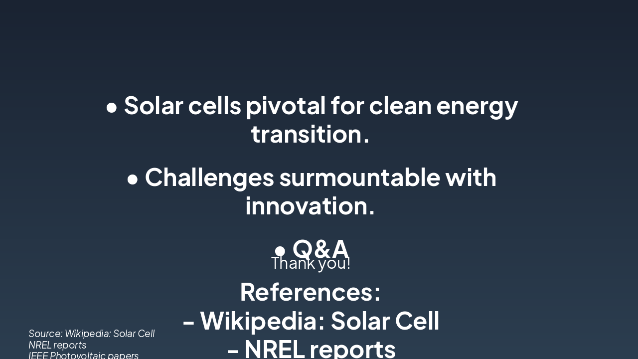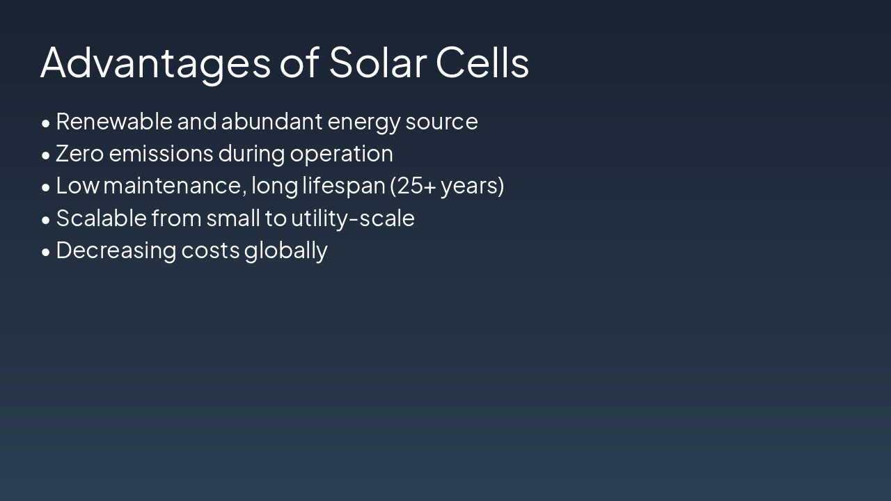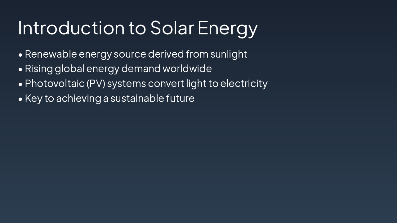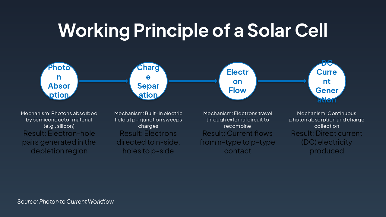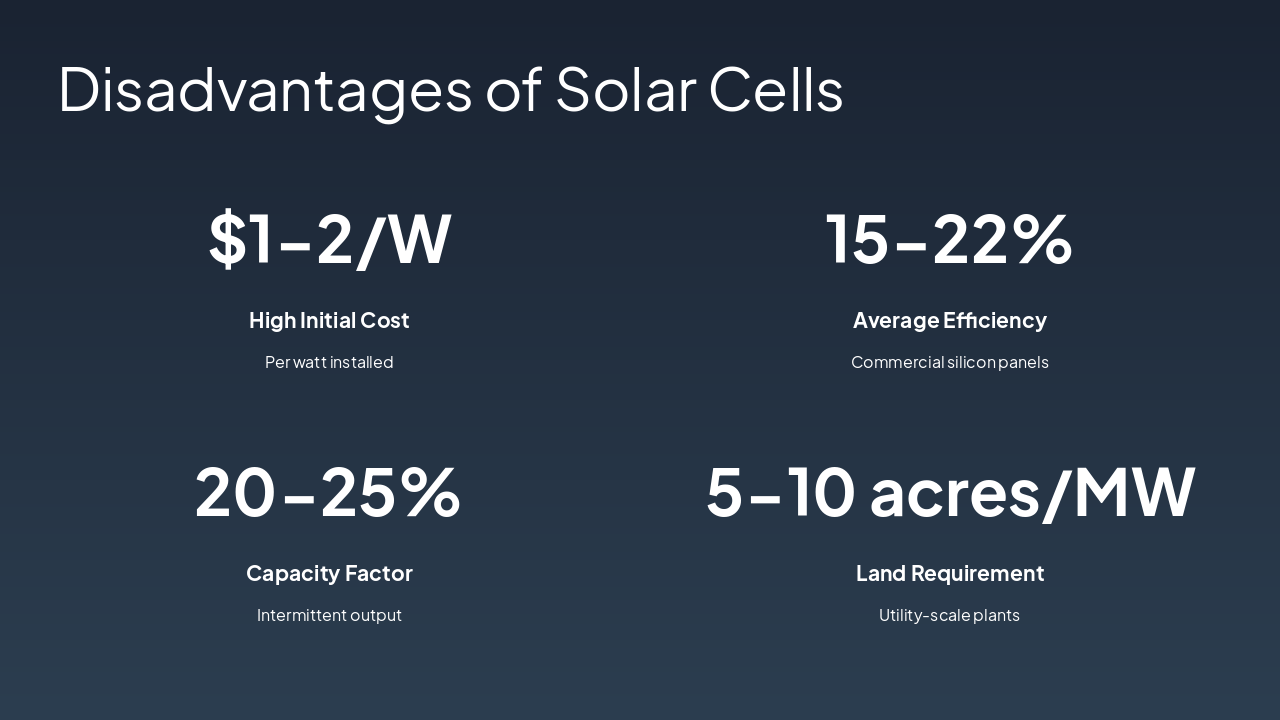 { "headers": [ "Type", "Efficiency", "Cost", "Notes" ], "rows": [ [ "Monocrystalline", "15-22%", "High", "Pure silicon, high perf" ], [ "Polycrystalline", "13-16%", "Medium", "Multi-crystal, affordable" ], [ "Thin-Film", "7-13%", "Low", "Flexible, CdTe/CIGS" ], [ "Perovskite", "20-25%", "Low", "Emerging, high potential" ] ] }