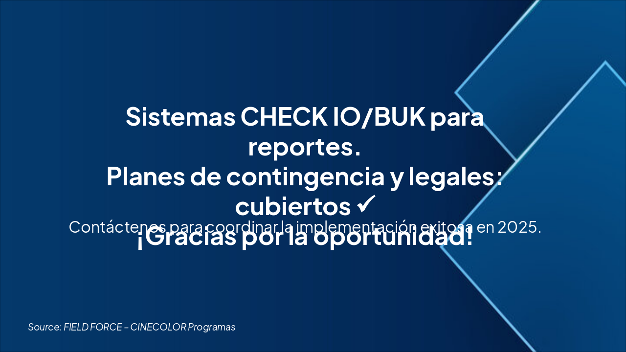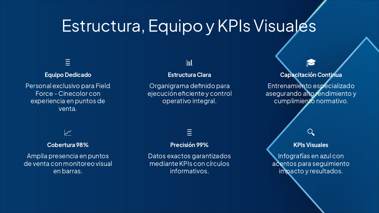{ "headers": [ "Fase", "Responsable", "Duración", "KPI / Métricas" ], "rows": [ [ "Reclutamiento", "RRHH Field Force", "15 días", "100% cobertura de vacantes" ], [ "Selección (SLA 95%)", "Equipo de Selección", "10 días", "95% SLA de cumplimiento" ], [ "Ejecución PDV", "Equipo PDV Cinecolor", "Ongoing", "Gráficos de desempeño >90%" ], [ "Reportería (CHECK IO/BUK)", "Control Operativo", "Diaria/Semanal", "Integración CHECK IO & BUK" ], [ "Contingencia", "Gestión de Contingencias", "On-demand", "Tiempo de respuesta <24h" ] ] }