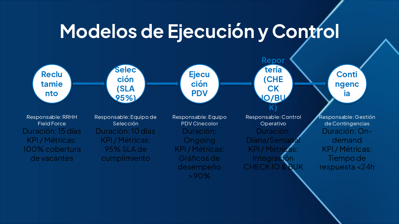 El slide presenta una tabla de modelos de ejecución y control con fases como Reclutamiento (15 días, RRHH Field Force, 100% cobertura), Selección (10 días, 95% SLA) y Ejecución PDV (ongoing, >90% desempeño). Incluye además Reportería (diaria/semanal, integración CHECK IO/BUK) y Contingencia (on-demand, <24h respuesta).