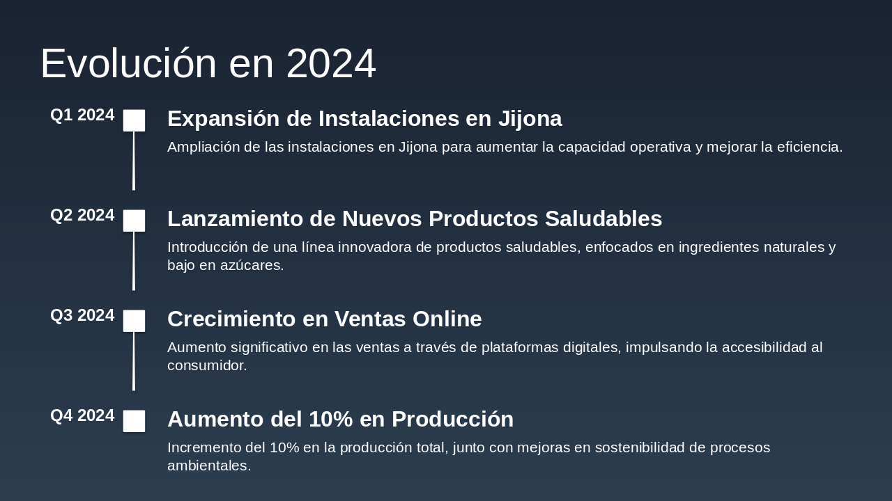Q1 2024: Expansión de Instalaciones en Jijona Ampliación de las instalaciones en Jijona para aumentar la capacidad operativa y mejorar la eficiencia. Q2 2024: Lanzamiento de Nuevos Productos Saludables Introducción de una línea innovadora de productos saludables, enfocados en ingredientes naturales y bajo en azúcares. Q3 2024: Crecimiento en Ventas Online Aumento significativo en las ventas a través de plataformas digitales, impulsando la accesibilidad al consumidor. Q4 2024: Aumento del 10% en Producción Incremento del 10% en la producción total, junto con mejoras en sostenibilidad de procesos ambientales.