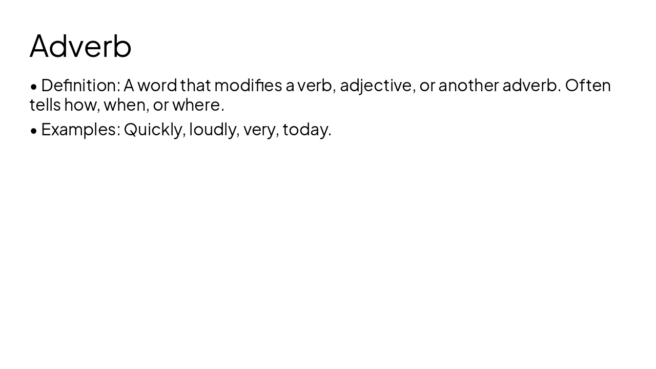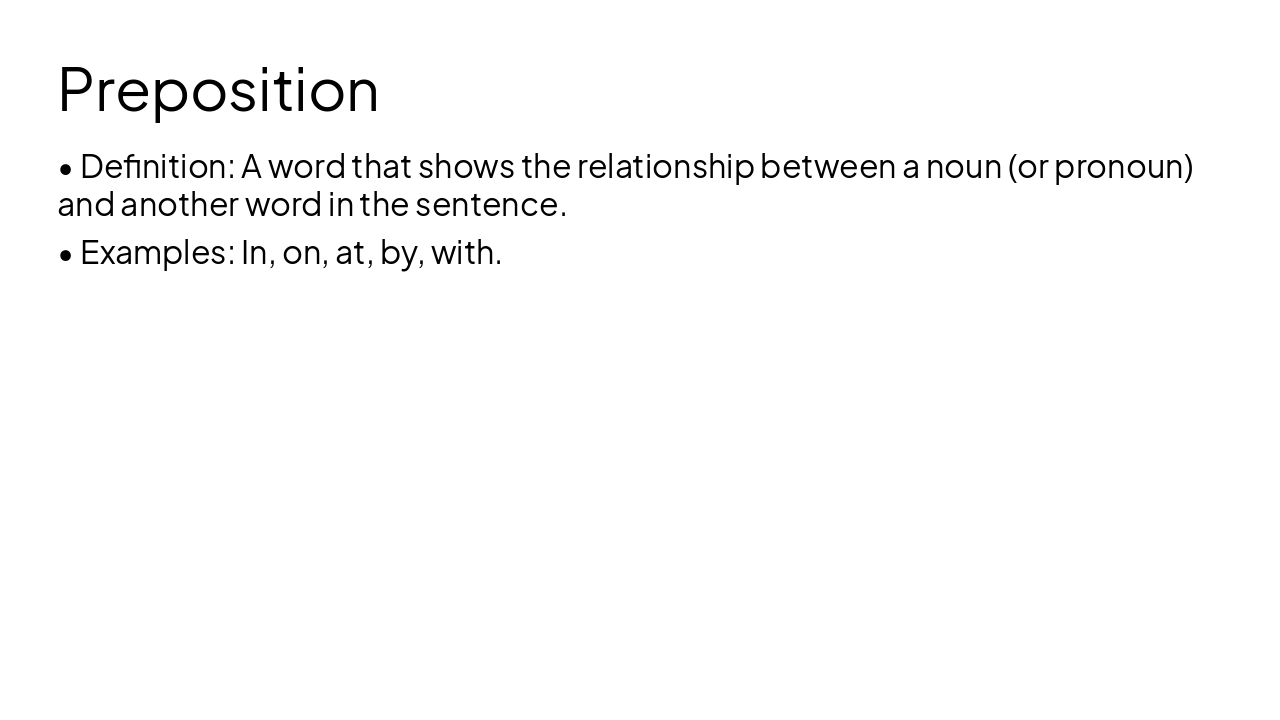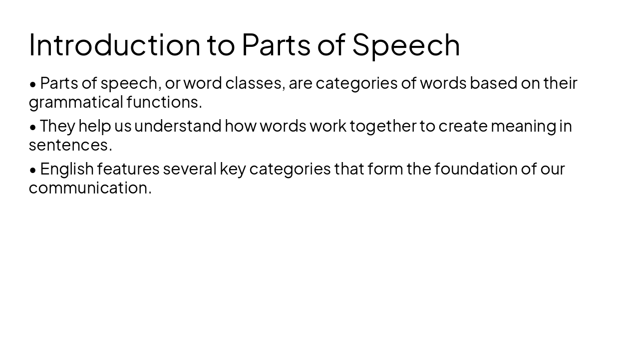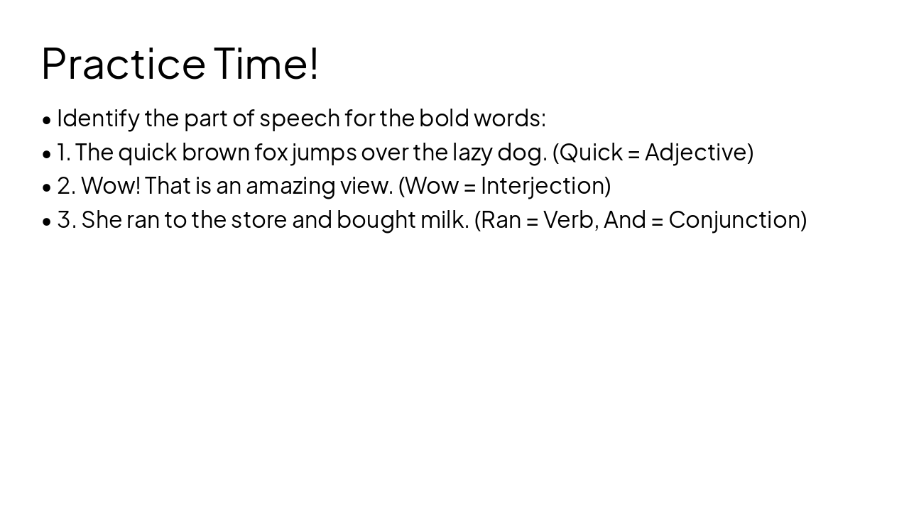 Create a clear educational presentation for students on Parts of Speech in English. Slides should include: Title slide; introduction to Parts of Speech; slide listing the 8 main parts of speech; individual slides explaining each part of speech (Noun, Pronoun, Verb, Adjective, Adverb, Preposition, Conjunction, Interjection) with simple definitions and 2–3 examples; a summary slide reviewing all parts of speech; and a short practice slide with example sentences where students identify the part of speech.