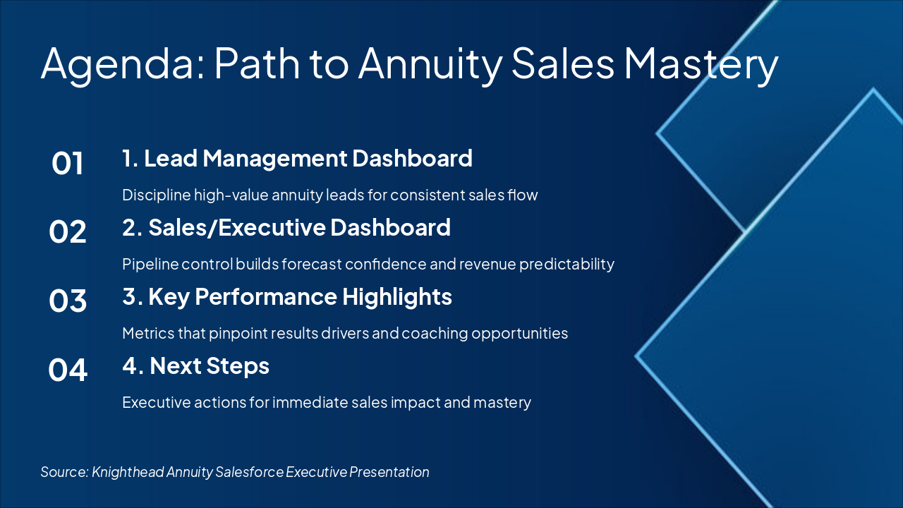 The agenda "Path to Annuity Sales Mastery" outlines four key items: a Lead Management Dashboard for disciplining high-value leads, a Sales/Executive Dashboard for pipeline control and revenue predictability, Key Performance Highlights for identifying results drivers, and Next Steps for immediate executive actions. This structure provides a roadmap to consistent sales flow, forecasting confidence, coaching opportunities, and sales mastery.