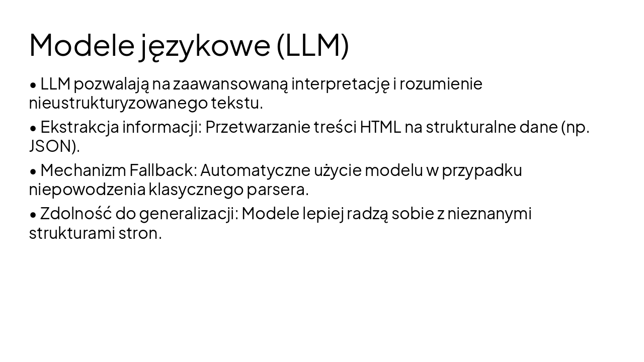 | 2. Parser | Próba ekstrakcji regułowej (CSS/XPath) | Klasyczny Web Scraper |