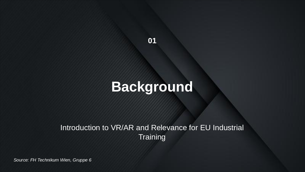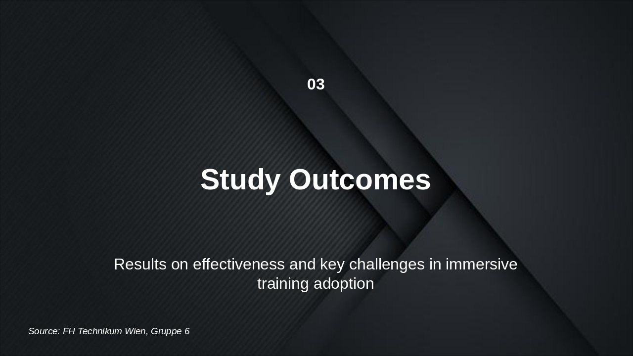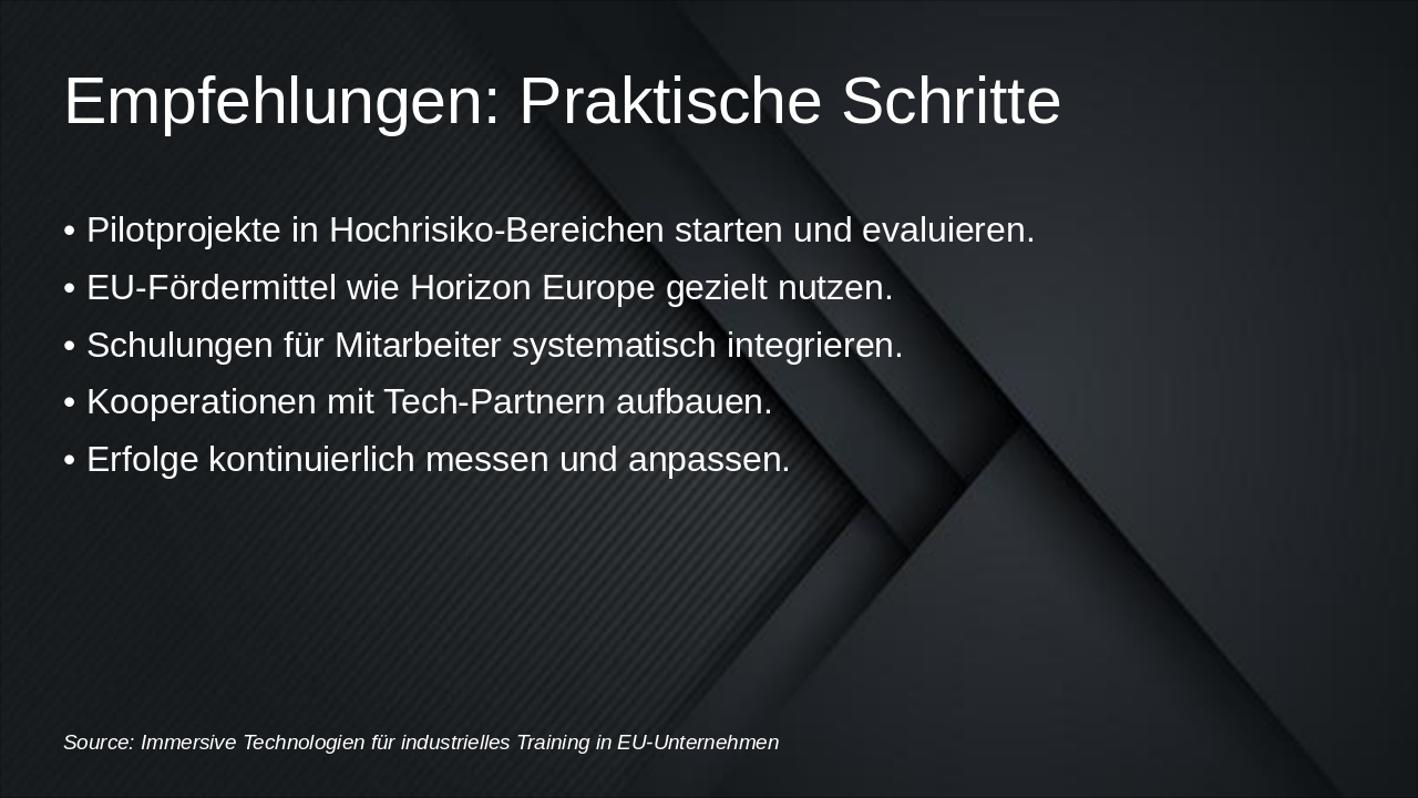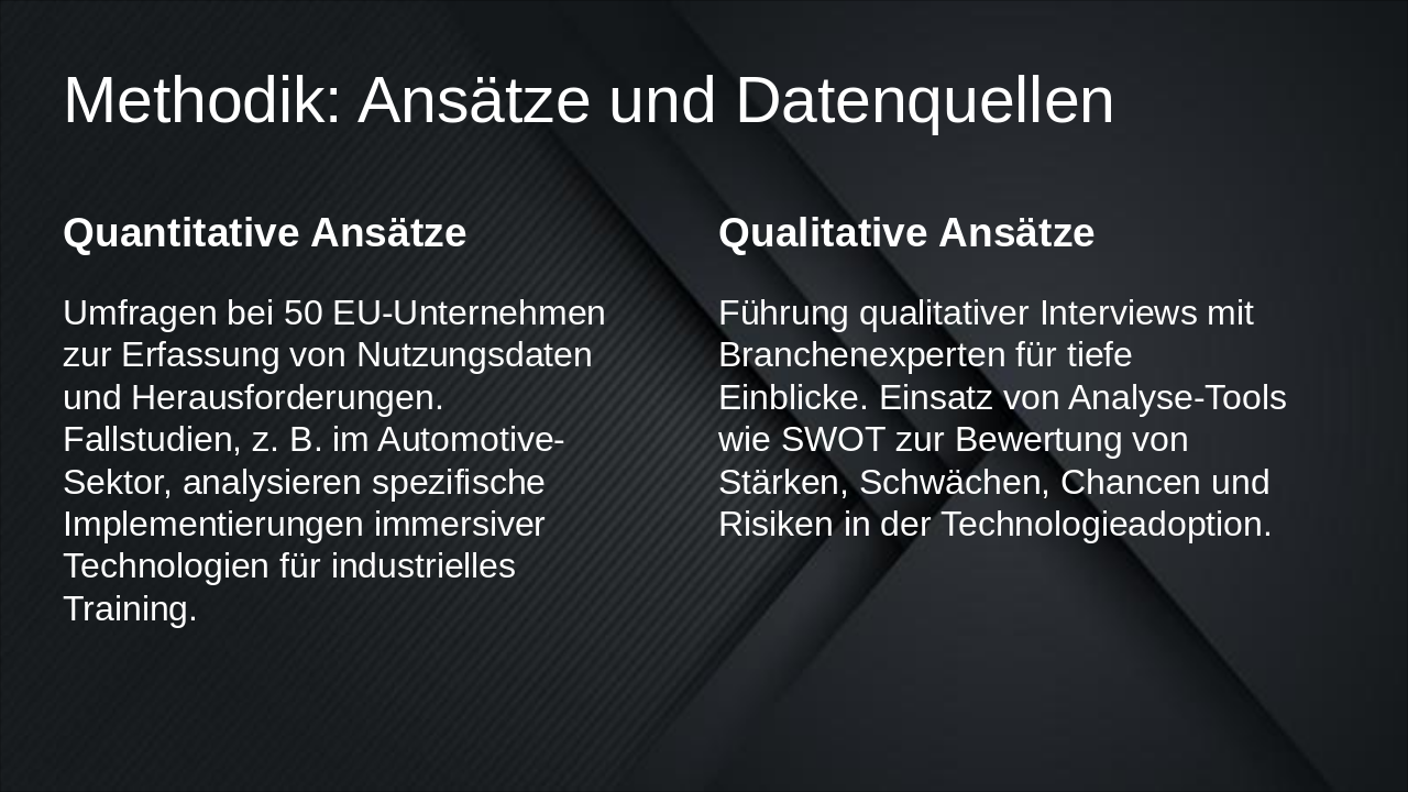 Überarbeite die Präsentation 'Immersive Technologien für industrielles Training in EU-Unternehmen' mit modernem, tech-inspiriertem Design. Behalte den fachlichen Inhalt bei, verbessere jedoch Design und Wording (außer der ersten Folie). Verwende dunkles Farbschema, klare Icons und prägnante, professionelle Sprache. Gliedere in: Background, Methodology, Outcomes, Recommendations, Conclusion.