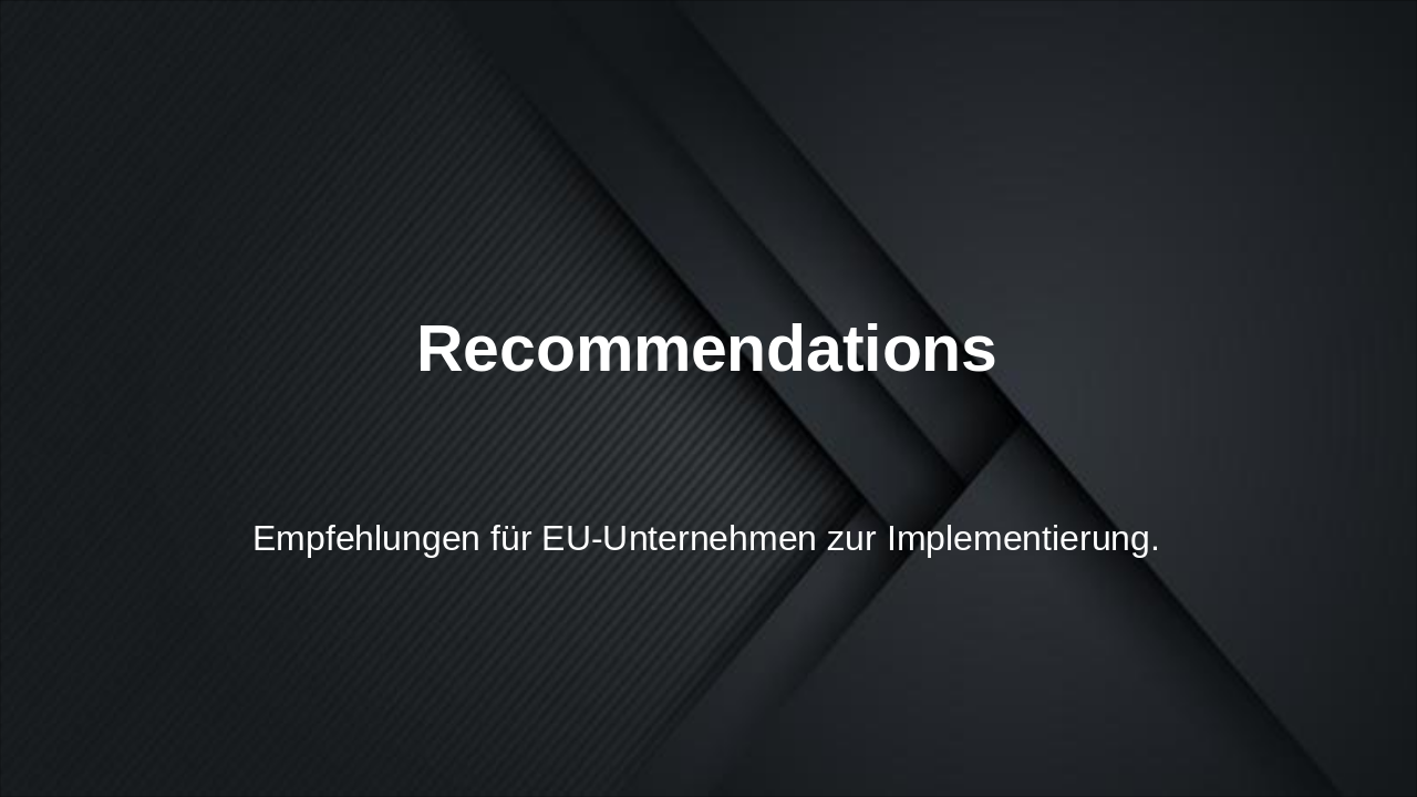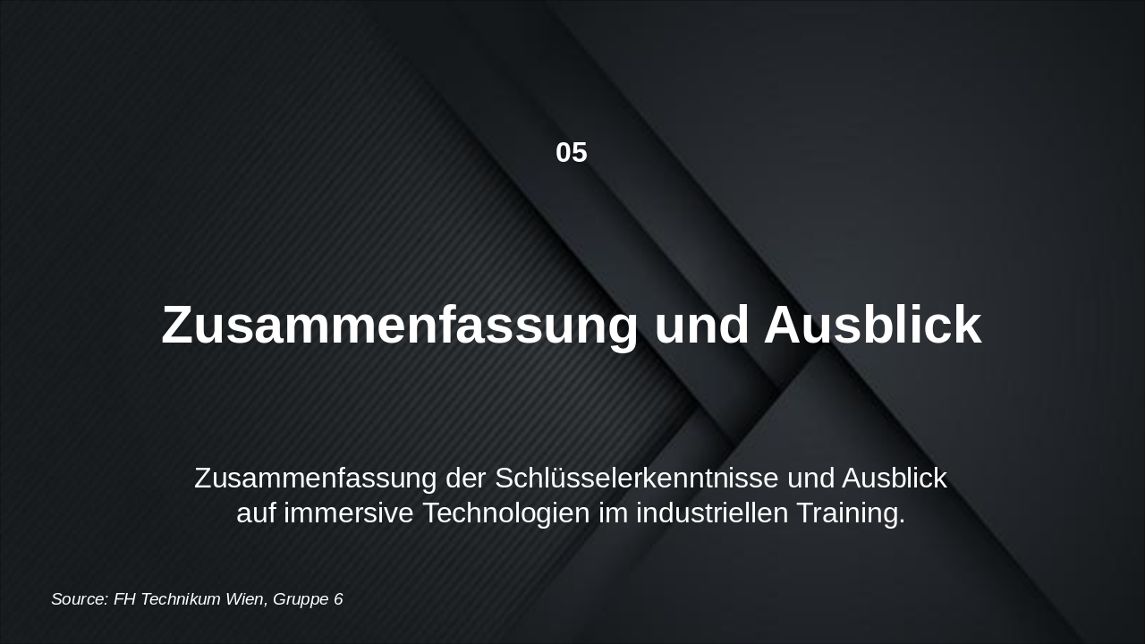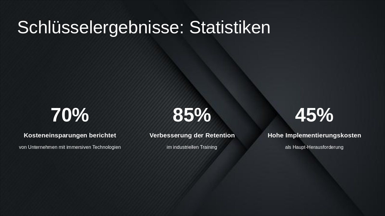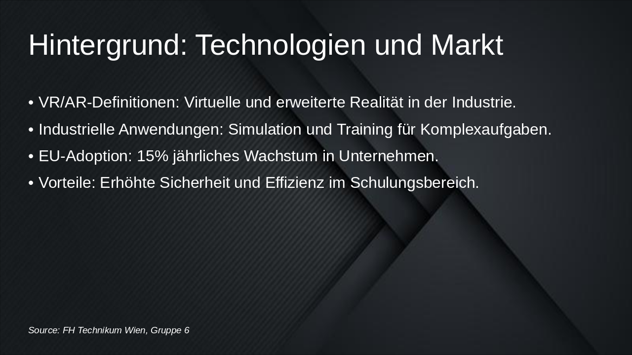 Überarbeite die Präsentation 'Immersive Technologien für industrielles Training in EU-Unternehmen' mit modernem, tech-inspiriertem Design. Behalte den fachlichen Inhalt bei, verbessere jedoch Design und Wording (außer der ersten Folie). Verwende dunkles Farbschema, klare Icons und prägnante, professionelle Sprache. Gliedere in: Background, Methodology, Outcomes, Recommendations, Conclusion.