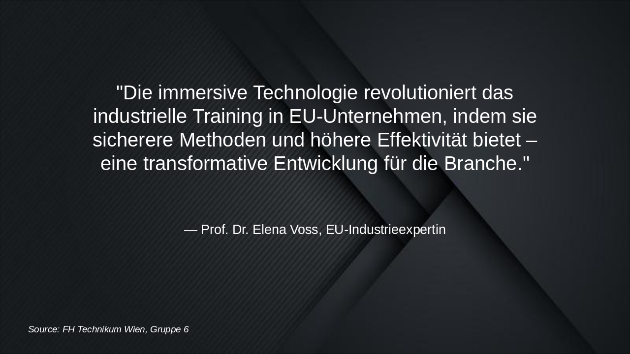 The slide, titled "Zitat aus der Studie" (Quote from the Study), features a quote highlighting how immersive technology is revolutionizing industrial training in EU companies by providing safer methods and greater efficiency—a transformative shift for the industry. The quote is attributed to Prof. Dr. Elena Voss, an EU industry expert.