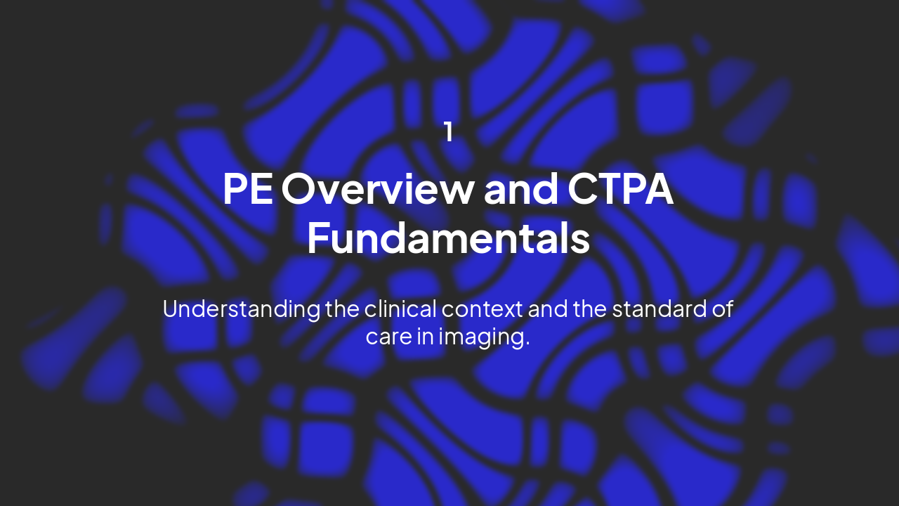 This CME-focused presentation covers PE fundamentals, CTPA protocols for image quality, diagnostic signs of pathology and RV strain, incidental findings, alternative modalities like V/Q and SPECT/CT, and emerging technologies such as photon-counting