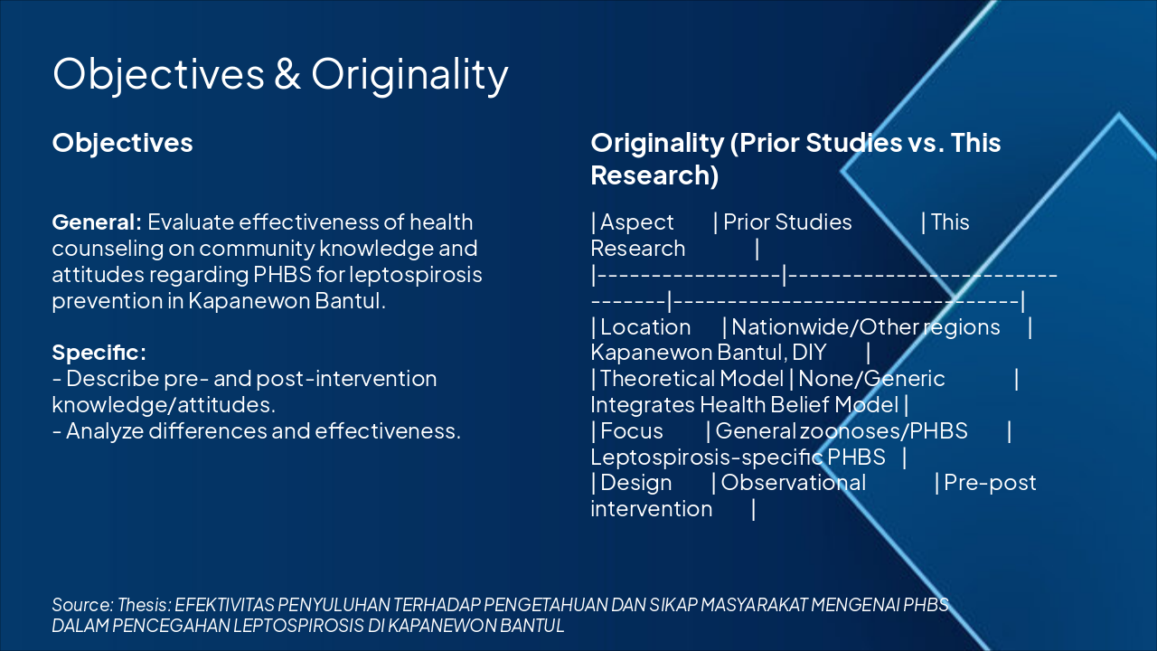 { "headers": [ "Step", "Description", "Key Elements / Hypothesis" ], "rows": [ [ "1. Theoretical Framework", "Health Belief Model (HBM) relevance", "Perceived susceptibility, severity, benefits, barriers, cues to action, self-efficacy drive PHBS adoption for leptospirosis prevention." ], [ "2. Conceptual Framework", "Variables flow diagram", "Education → Improved Knowledge & Attitudes → Enhanced PHBS Practices (visual arrow flow)." ], [ "3. Null Hypothesis (H0)", "No effect of education", "No significant difference in knowledge, attitudes, PHBS pre- vs. post-intervention (e.g., μpre = μpost)." ], [ "4. Alternative Hypothesis (H1)", "Positive effect of education", "Significant improvement in knowledge, attitudes, PHBS post-intervention (e.g., μpre < μpost)." ] ] }