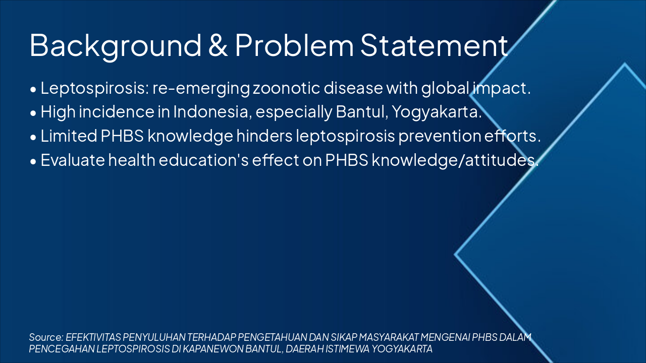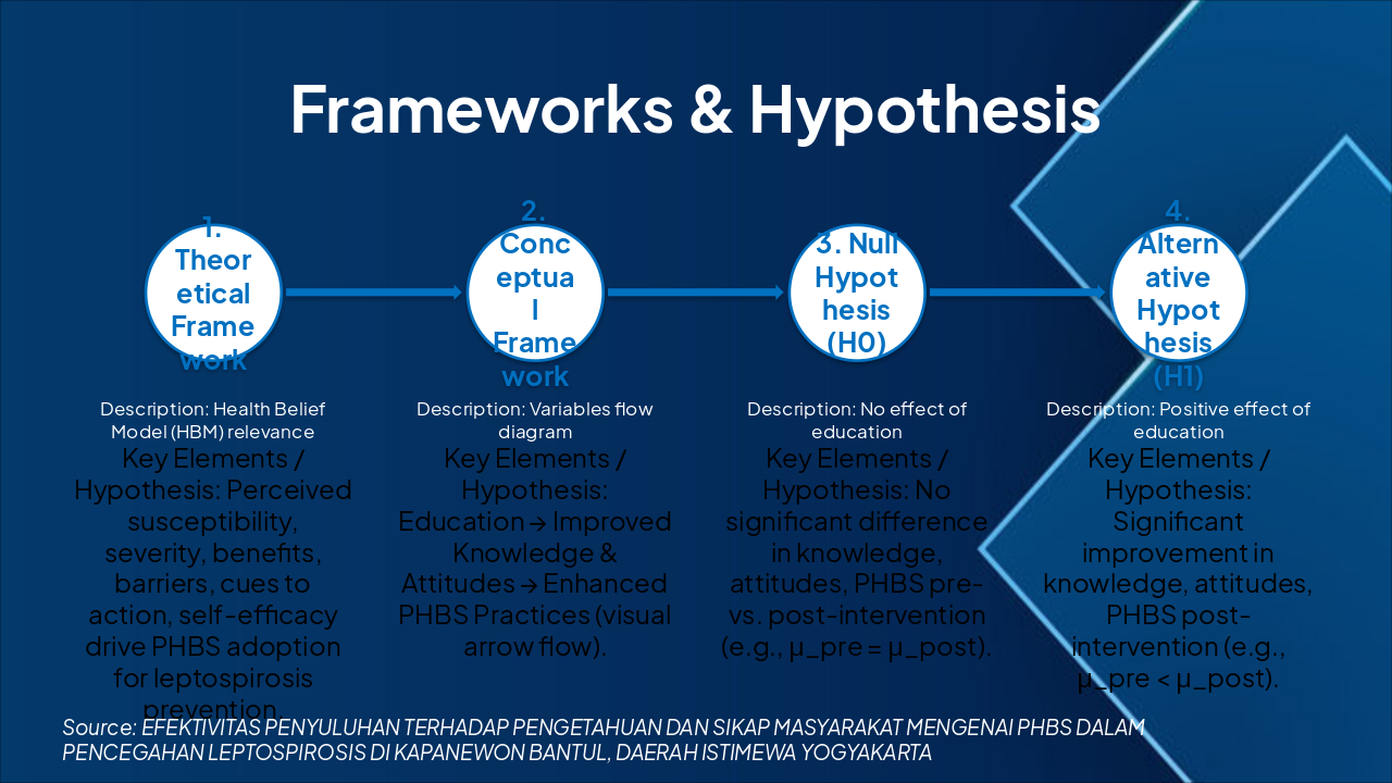 Highlight HBM's role in explaining behavior change for PHBS in leptospirosis prevention. Describe the variables flow diagram (education → knowledge/attitudes → PHBS). Clearly state null (H0: no significant difference pre/post-education) and alternative (H1: significant improvement) hypotheses.