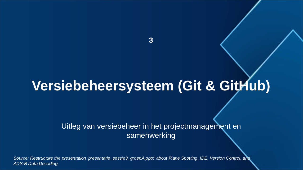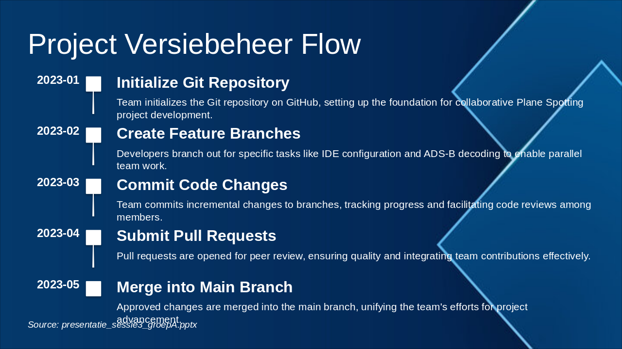 The Project Versiebeheer Flow timeline outlines the Git-based version control process for the collaborative Plane Spotting project, starting with initializing the repository on GitHub in January 2023 to establish a development foundation. It progresses through creating feature branches for parallel tasks in February, committing incremental changes in March, submitting pull requests for peer review in April, and merging approved updates into the main branch in May to unify team efforts.