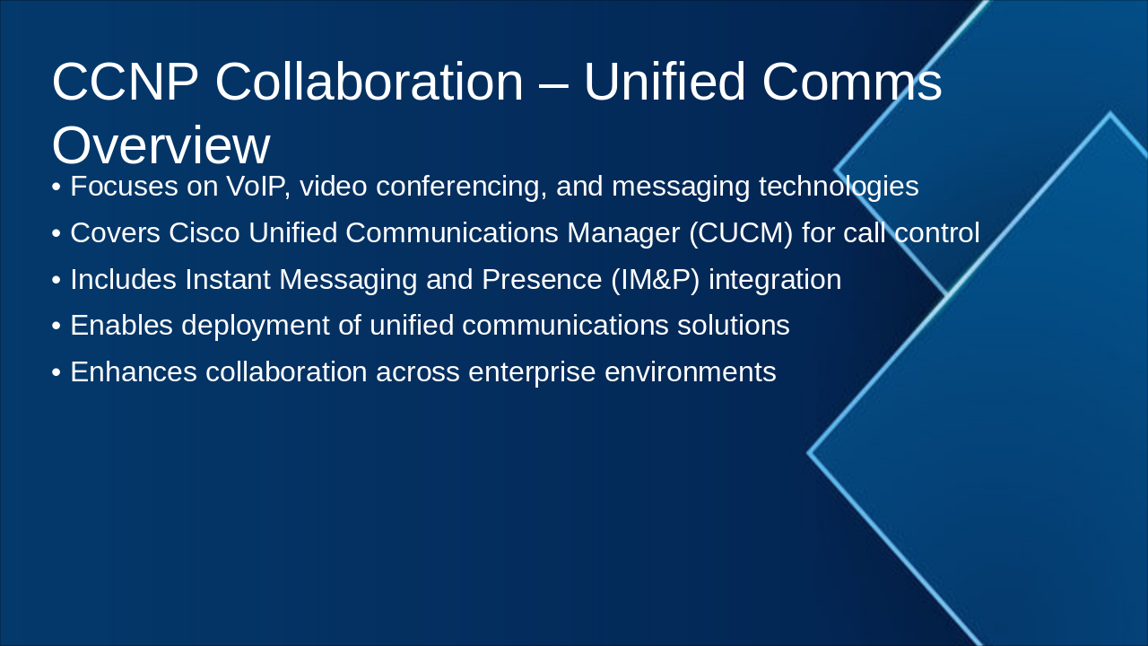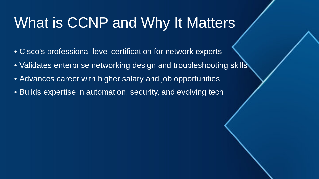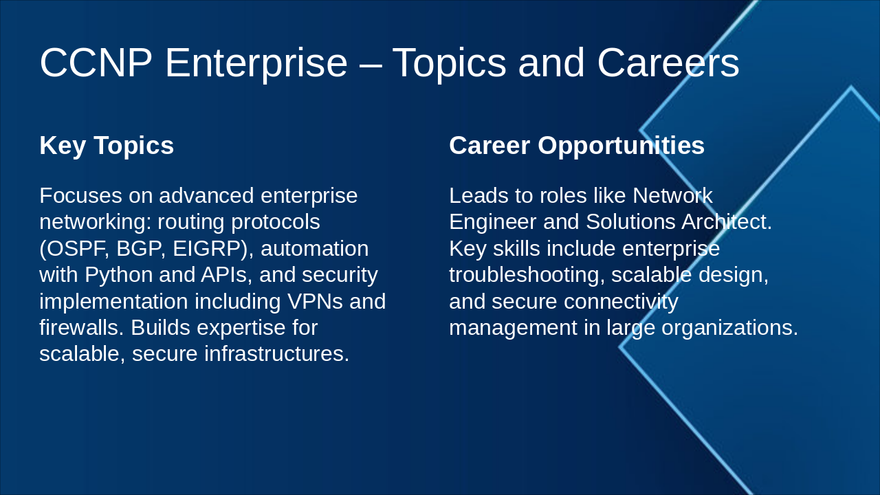 The CCNP Enterprise certification slide highlights key topics in advanced enterprise networking, including routing protocols like OSPF, BGP, and EIGRP, automation using Python and APIs, and security features such as VPNs and firewalls, all aimed at building expertise in scalable, secure infrastructures. On the career side, it outlines opportunities in roles like Network Engineer and Solutions Architect, emphasizing skills in enterprise troubleshooting, scalable design, and secure connectivity management for large organizations.