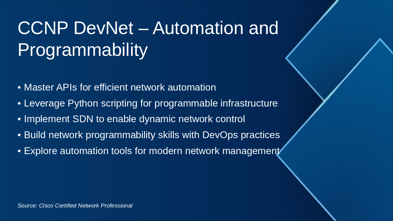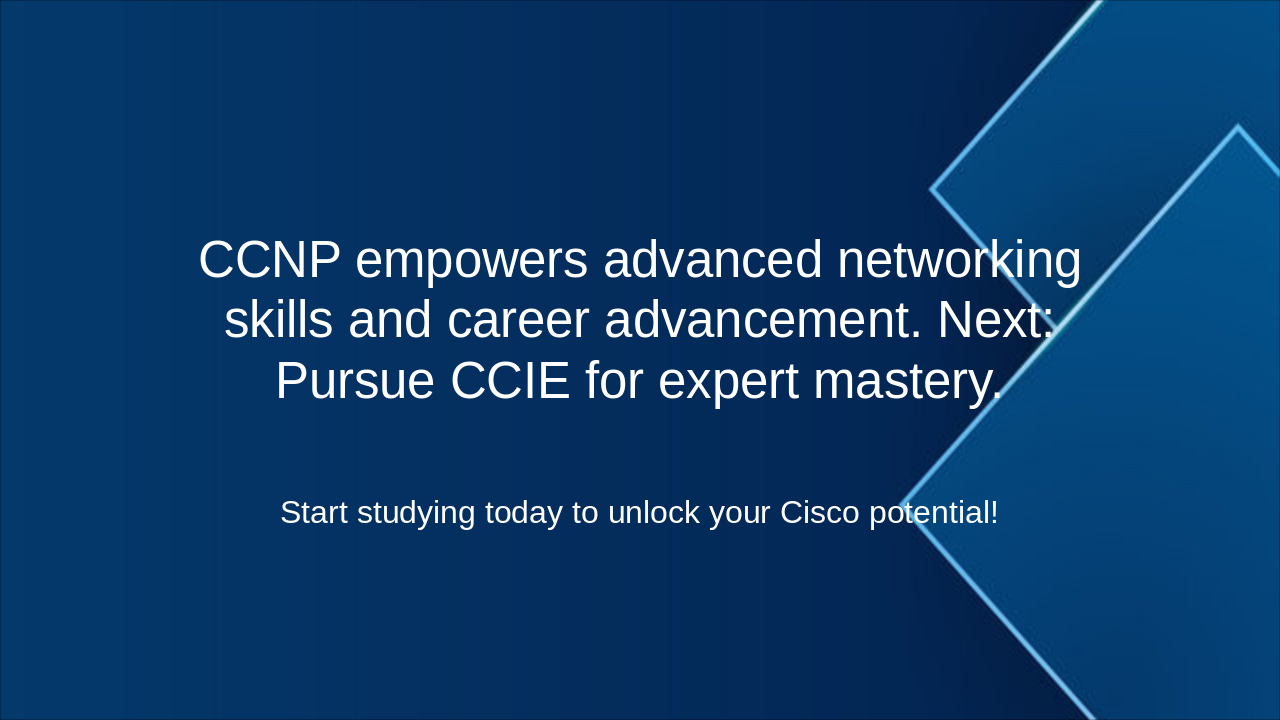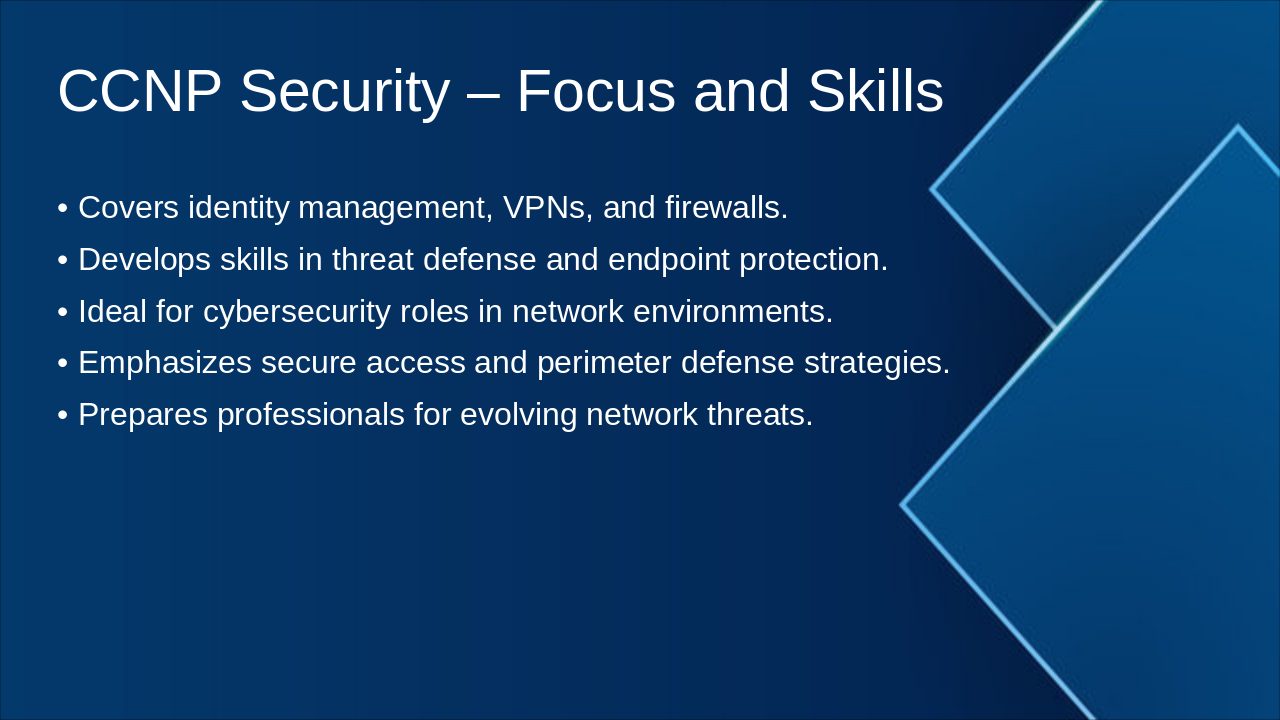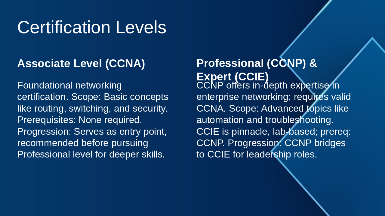 | Focuses on advanced enterprise networking: routing protocols (OSPF, BGP, EIGRP), automation with Python and APIs, and security implementation including VPNs and firewalls. Builds expertise for scalable, secure infrastructures. | Leads to roles like Network Engineer and Solutions Architect. Key skills include enterprise troubleshooting, scalable design, and secure connectivity management in large organizations. |